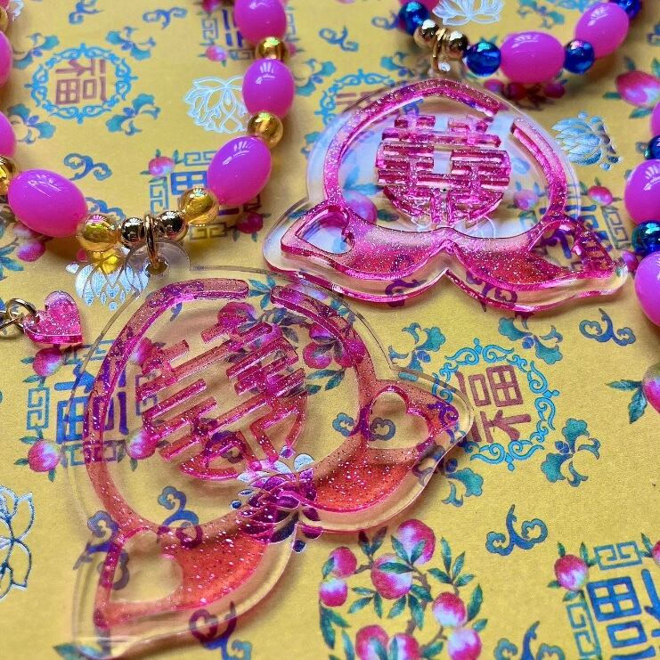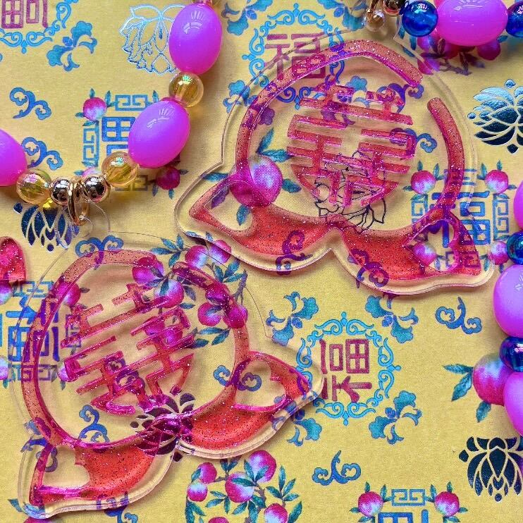 クリアのアクリル板にラメ入りクリアピンクを重ねたトップは、縁起物の桃の形の中にダブルハピネスの文字を入れた、幸福度満載のアイテム♡