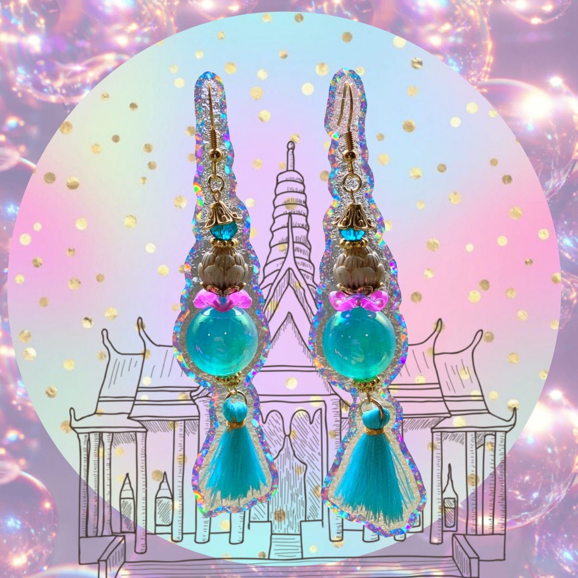 ミニタッセルを取り付けた上部のビーズたちは、なんとなくタイのモンドップを思わせる尖塔のようなデザイン。