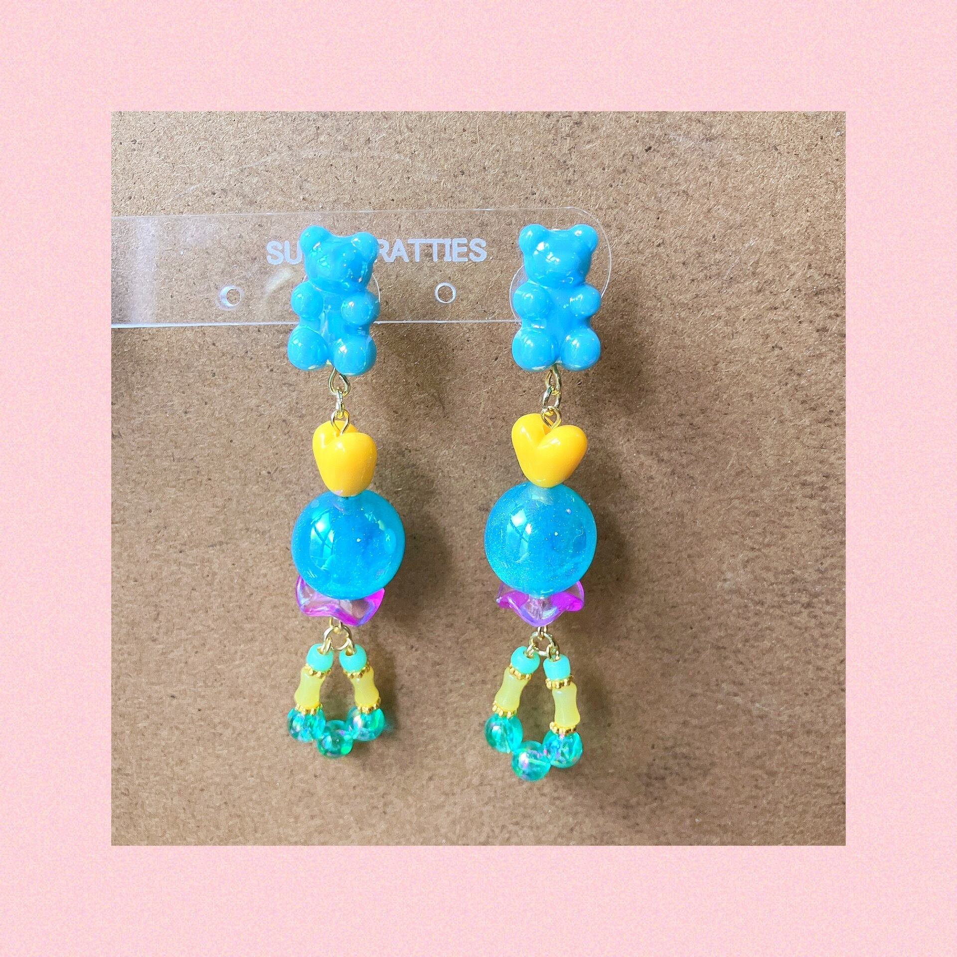 オーロラ加工のミルキーグミベアと、微粒子パールが眩いボールビーズ、末端にはビーズを連ねた輪っかのチャームでポップに仕上げました。