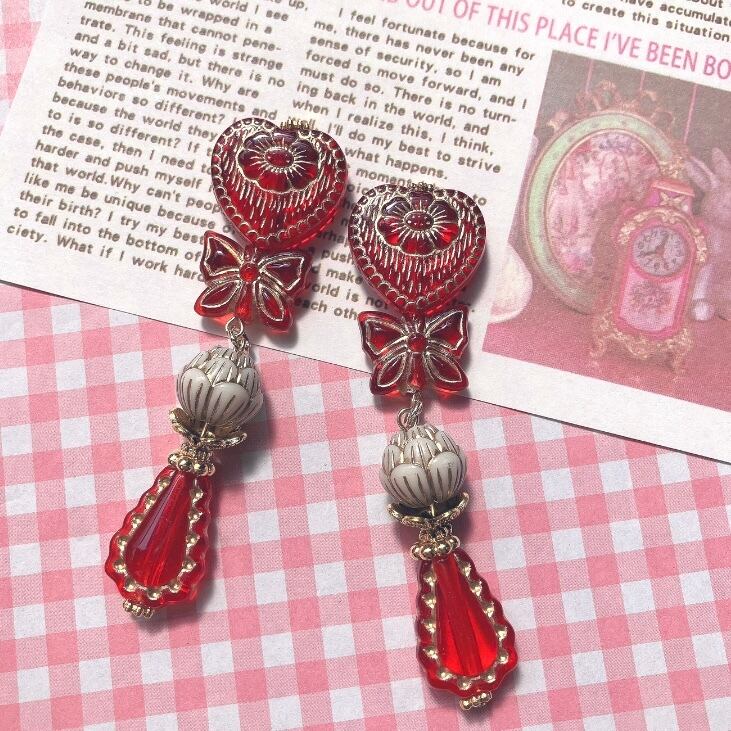 お花や蝶々などのアンティーク風デザインビーズを繋ぎ合わせたイヤーアクセサリー。