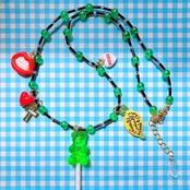 ベア型ロリポップやチェリーなど大小6つのチャームが付いたビーズネックレスです。