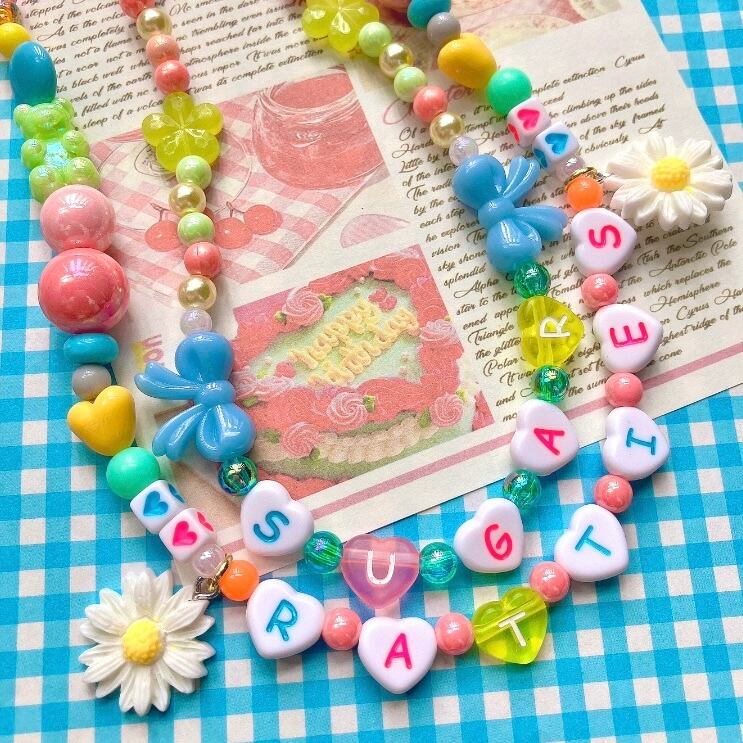 とハートのアルファベットビーズに加え、下段には2つのマーガレットチャームを配置。