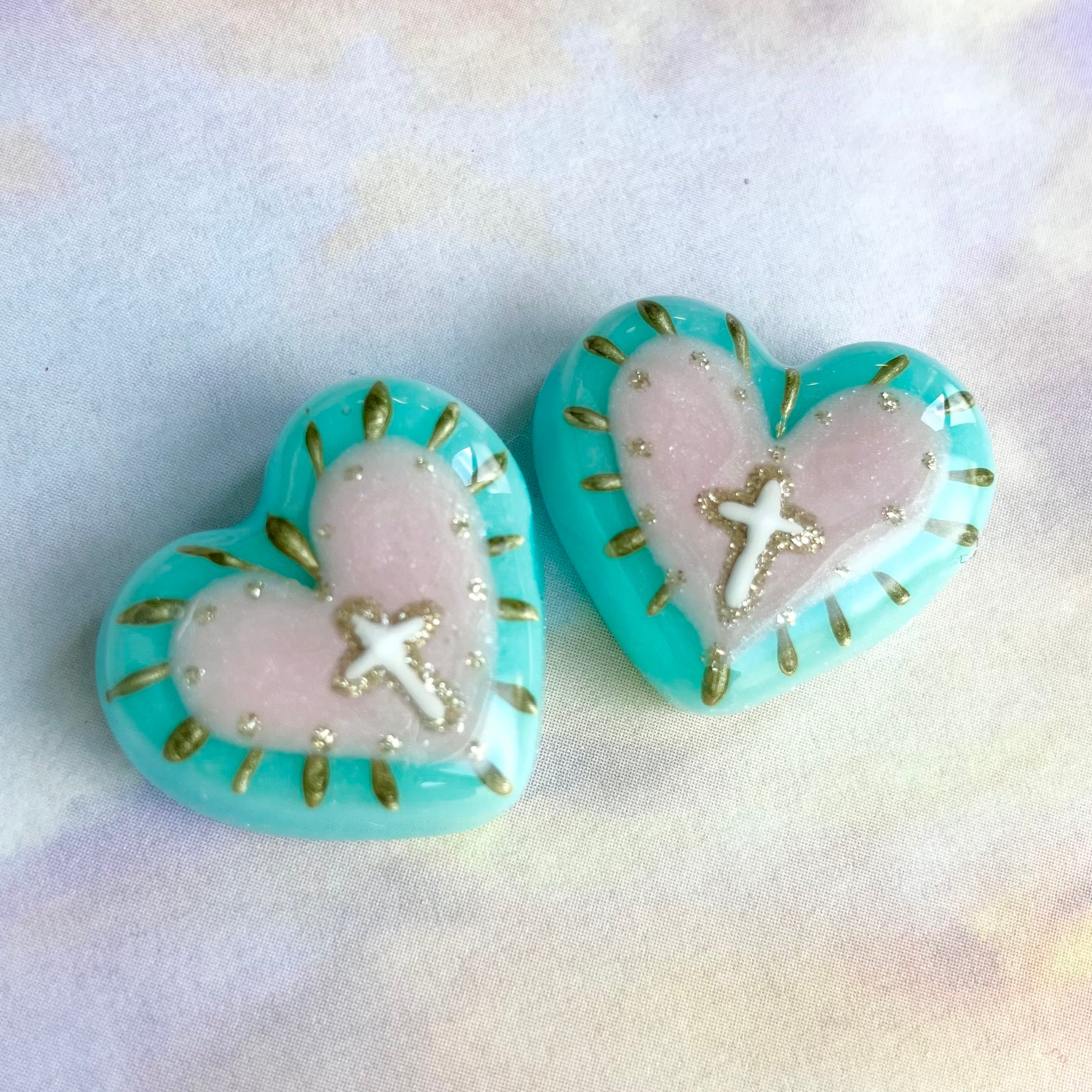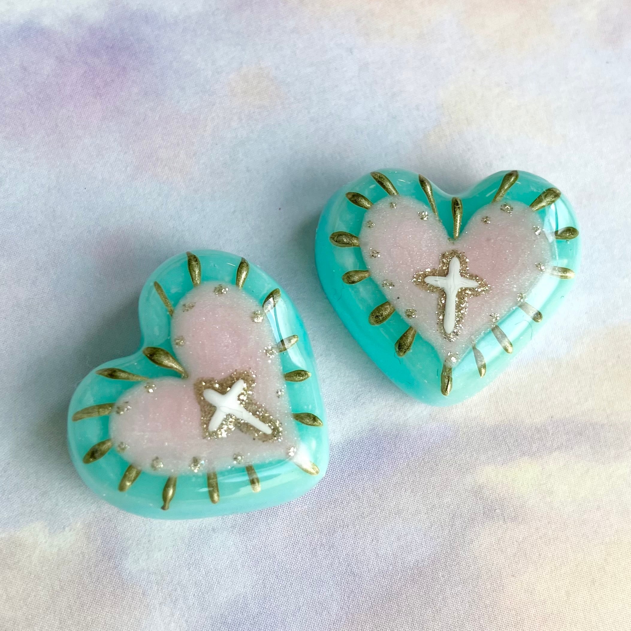 後光がさす十字架を描いた粘土製ハートの御守り的アイテムです。