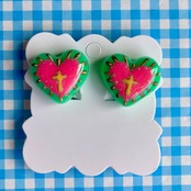 後光がさす十字架を描いた粘土製ハートの御守り的アイテムです。