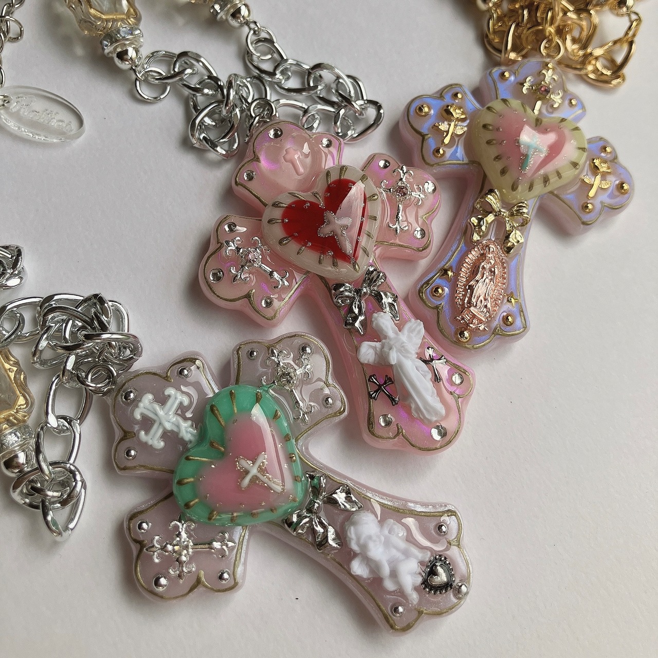 SUGAR RATTIESの定番品、手描きの絵柄が入ったアミュレットハートをドッキングさせた十字架は、縁の手描きラインに加え、ハートと重ねているため厚みと見た目の重厚感があります。