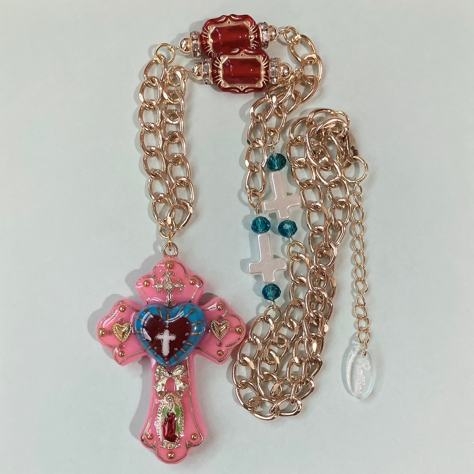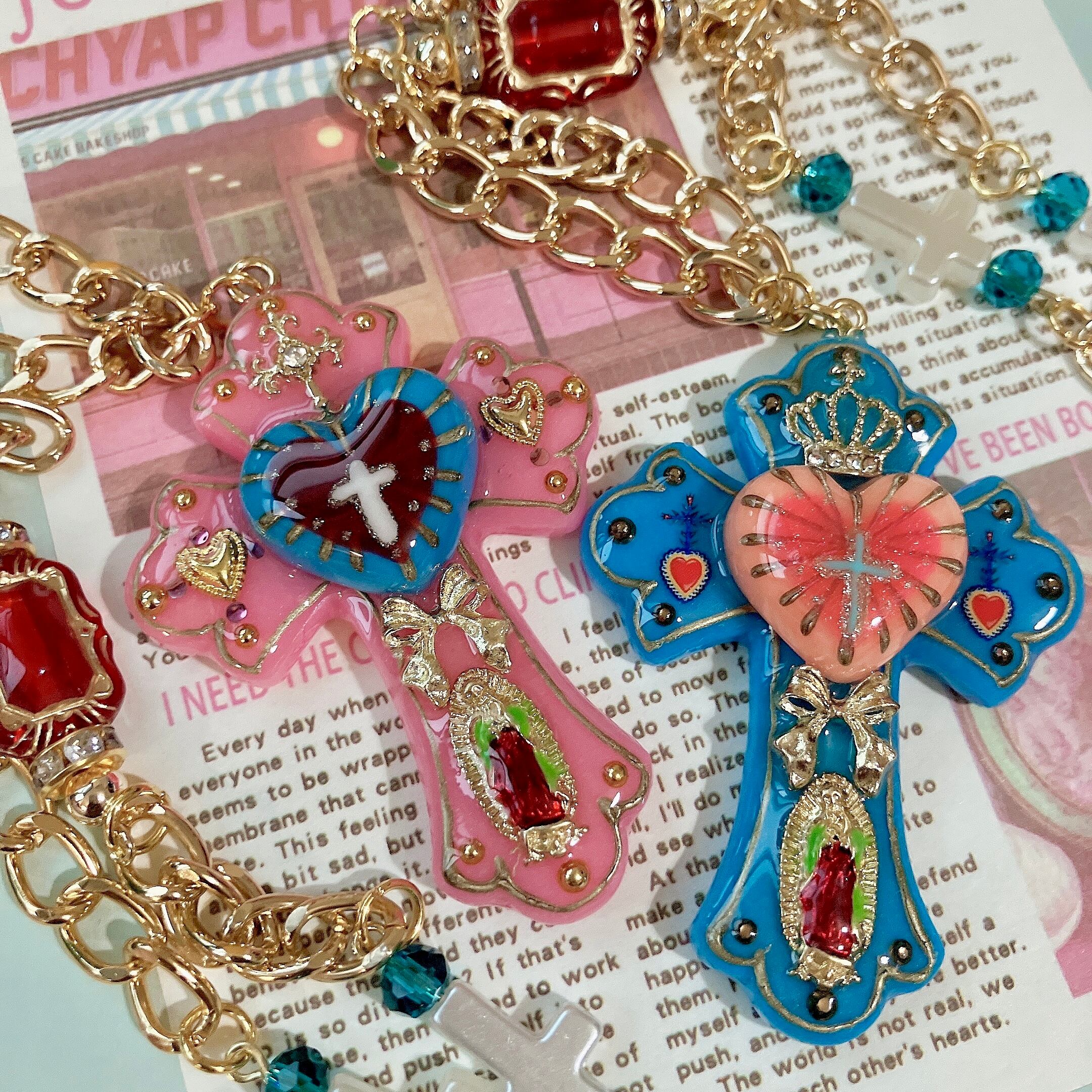 SUGAR RATTIESの定番品、手描きの絵柄が入ったアミュレットハートをドッキングさせた十字架は、縁の手描きラインに加え、ハートと重ねているため厚みと見た目の重厚感があります。