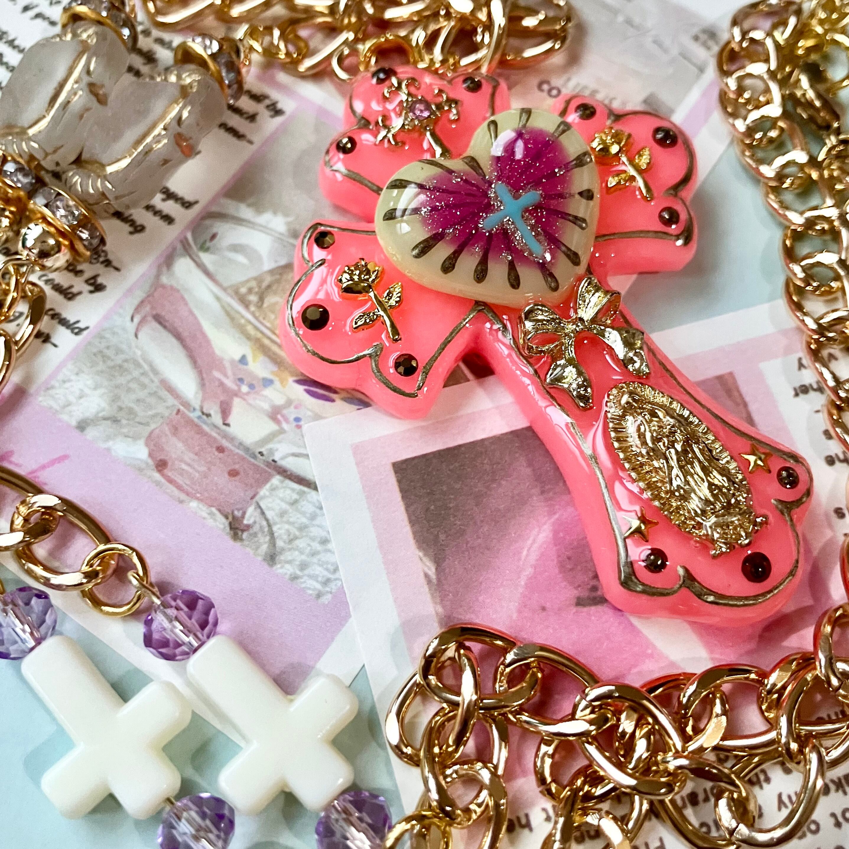 SUGAR RATTIESの定番品、手描きの絵柄が入ったアミュレットハートをドッキングさせた十字架は、縁の手描きラインに加え、ハートと重ねているため厚みと見た目の重厚感があります。