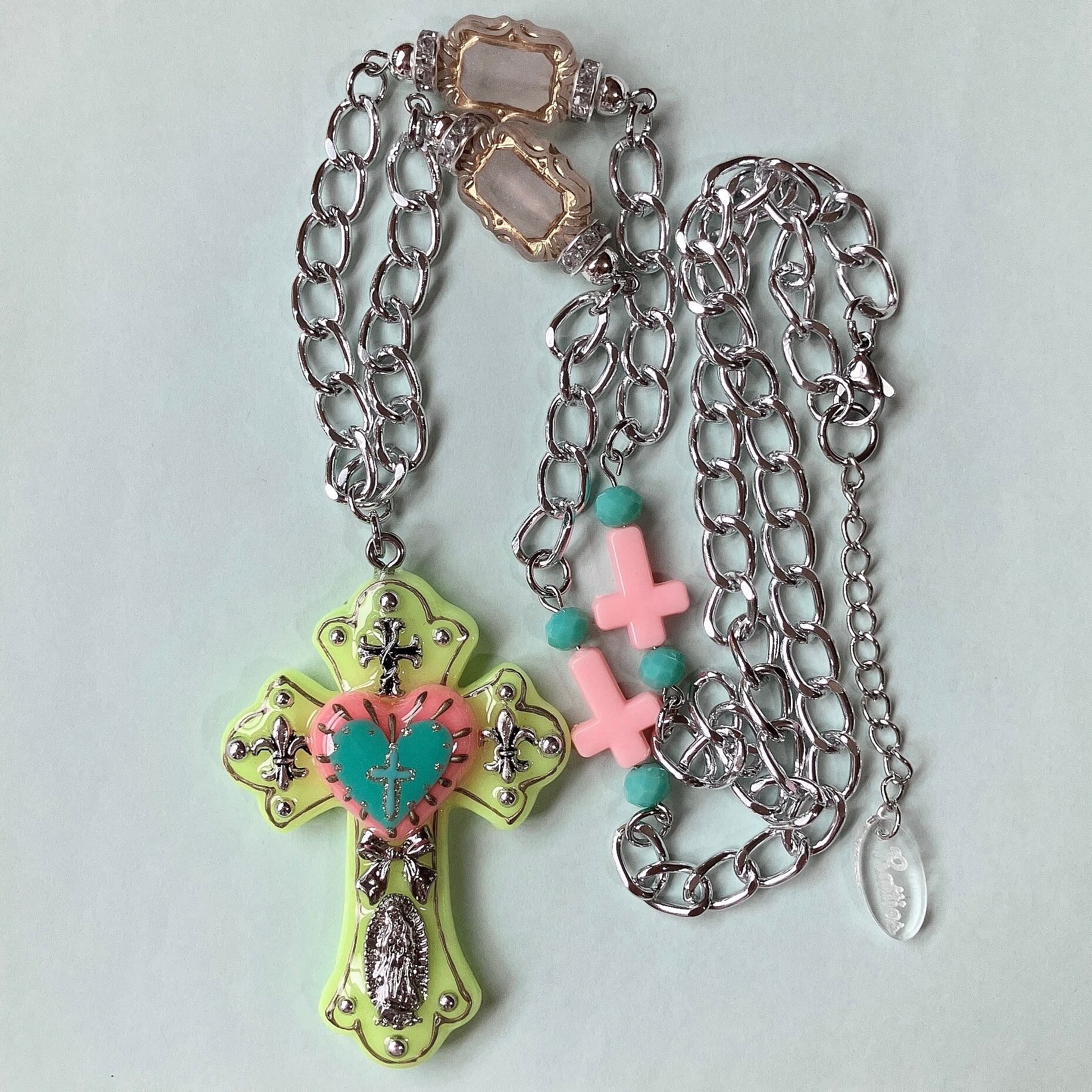 SUGAR RATTIESの定番品、手描きの絵柄が入ったアミュレットハートをドッキングさせた十字架は、縁の手描きラインに加え、ハートと重ねているため厚みと見た目の重厚感があります。