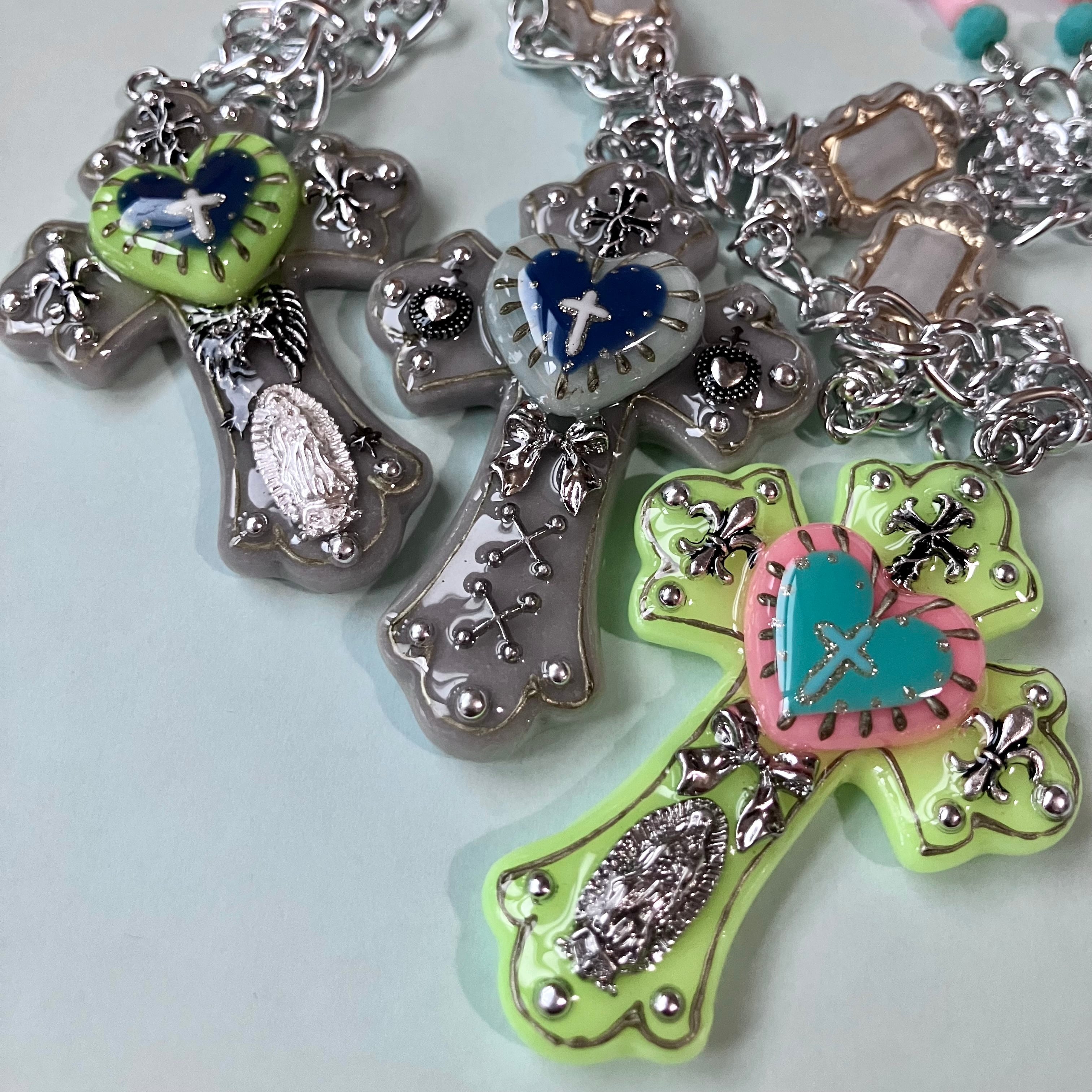 SUGAR RATTIESの定番品、手描きの絵柄が入ったアミュレットハートをドッキングさせた十字架は、縁の手描きラインに加え、ハートと重ねているため厚みと見た目の重厚感があります。