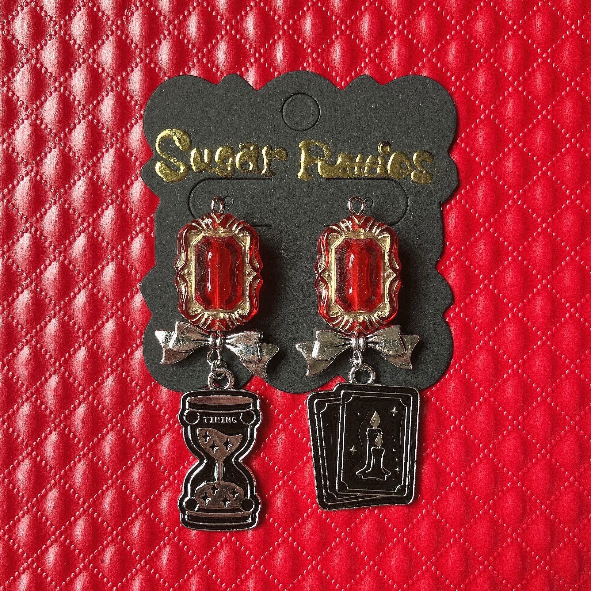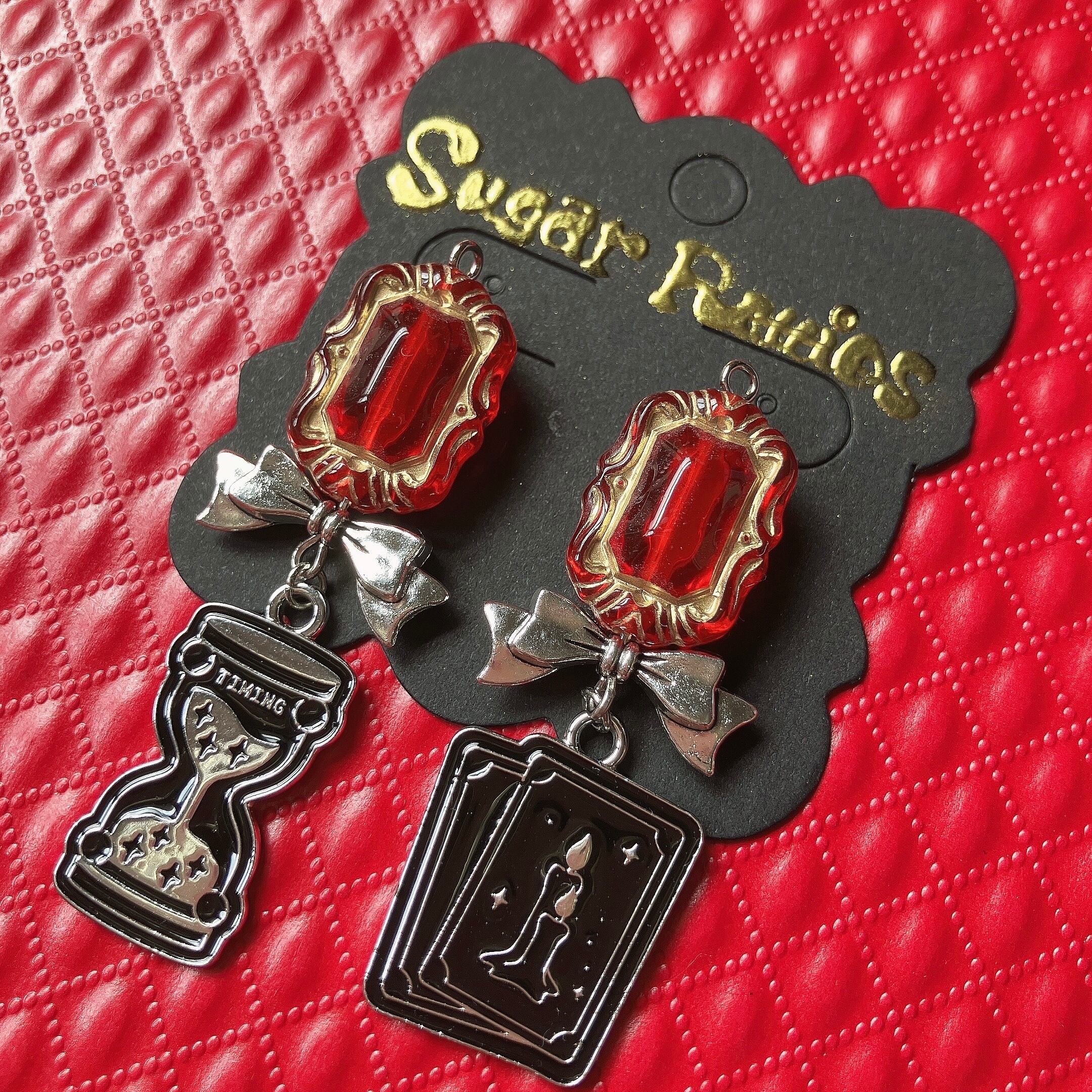 クリアレッドのアンティーク調デザインビーズにシルバーのミニリボン、左右絵柄違いのチャームが揺れるイヤーアクセサリー。