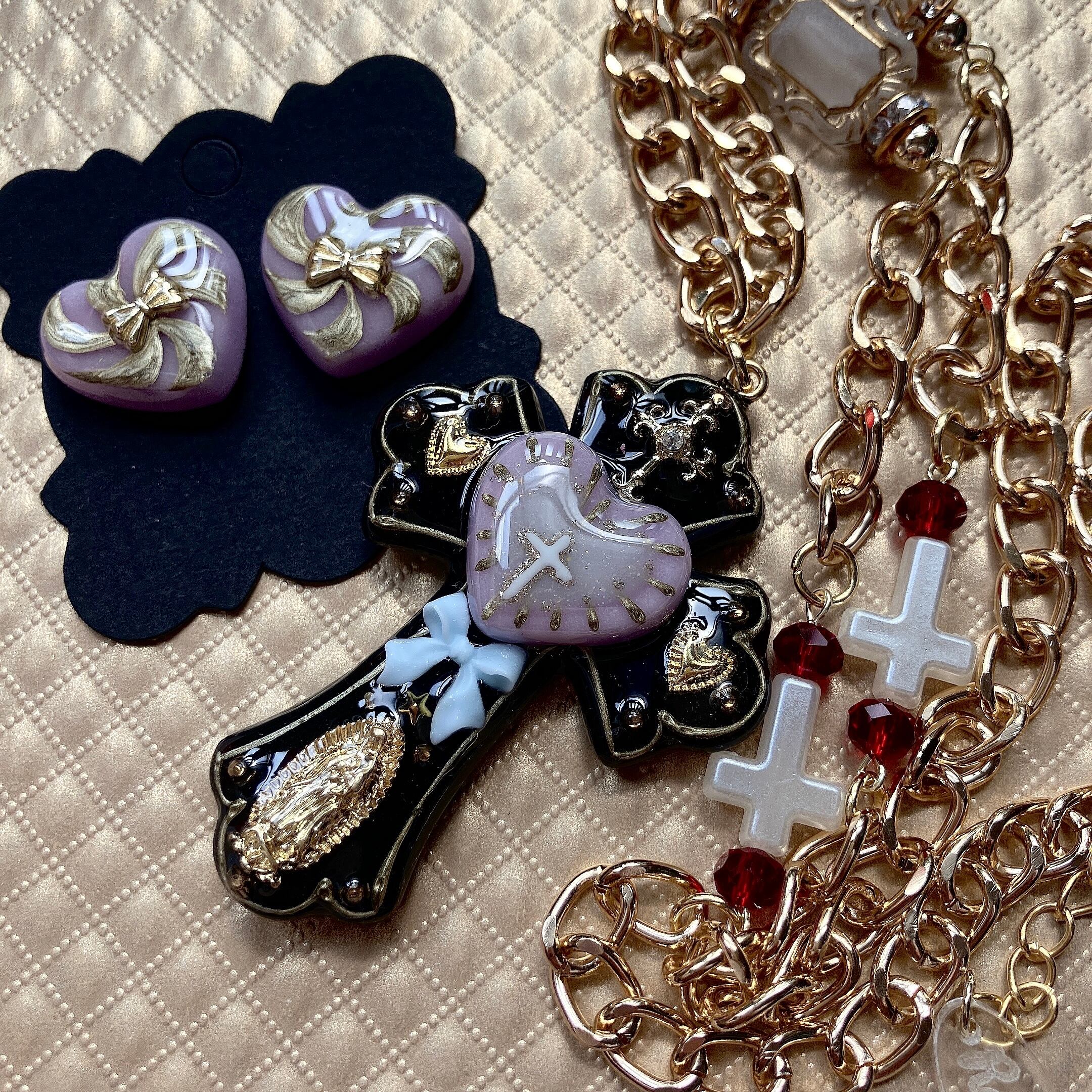 SUGAR RATTIESの定番品、手描きの絵柄が入ったアミュレットハートをドッキングさせた十字架は、縁の手描きラインに加え、ハートと重ねているため厚みと見た目の重厚感があります。