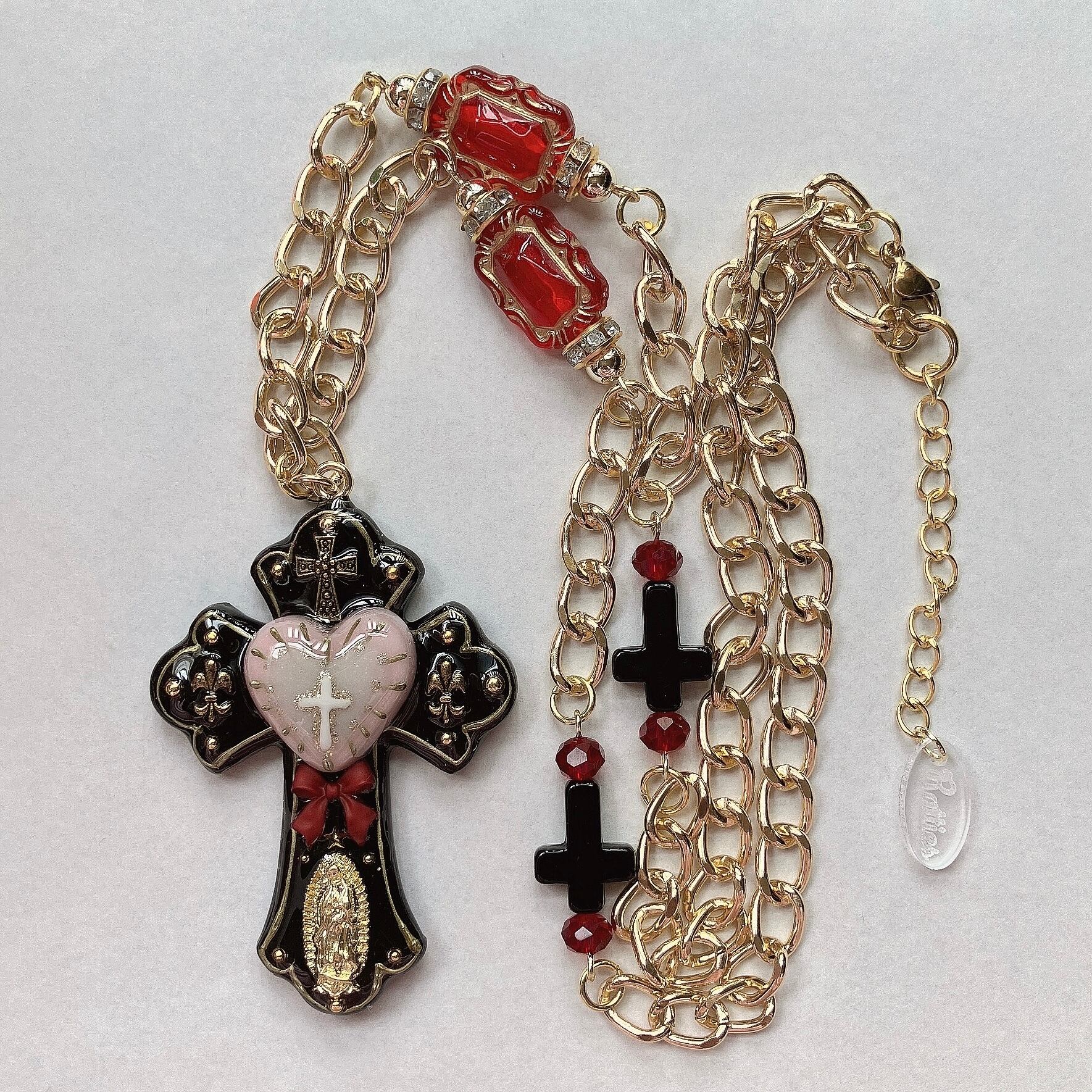 SUGAR RATTIESの定番品、手描きの絵柄が入ったアミュレットハートをドッキングさせた十字架は、縁の手描きラインに加え、ハートと重ねているため厚みと見た目の重厚感があります。