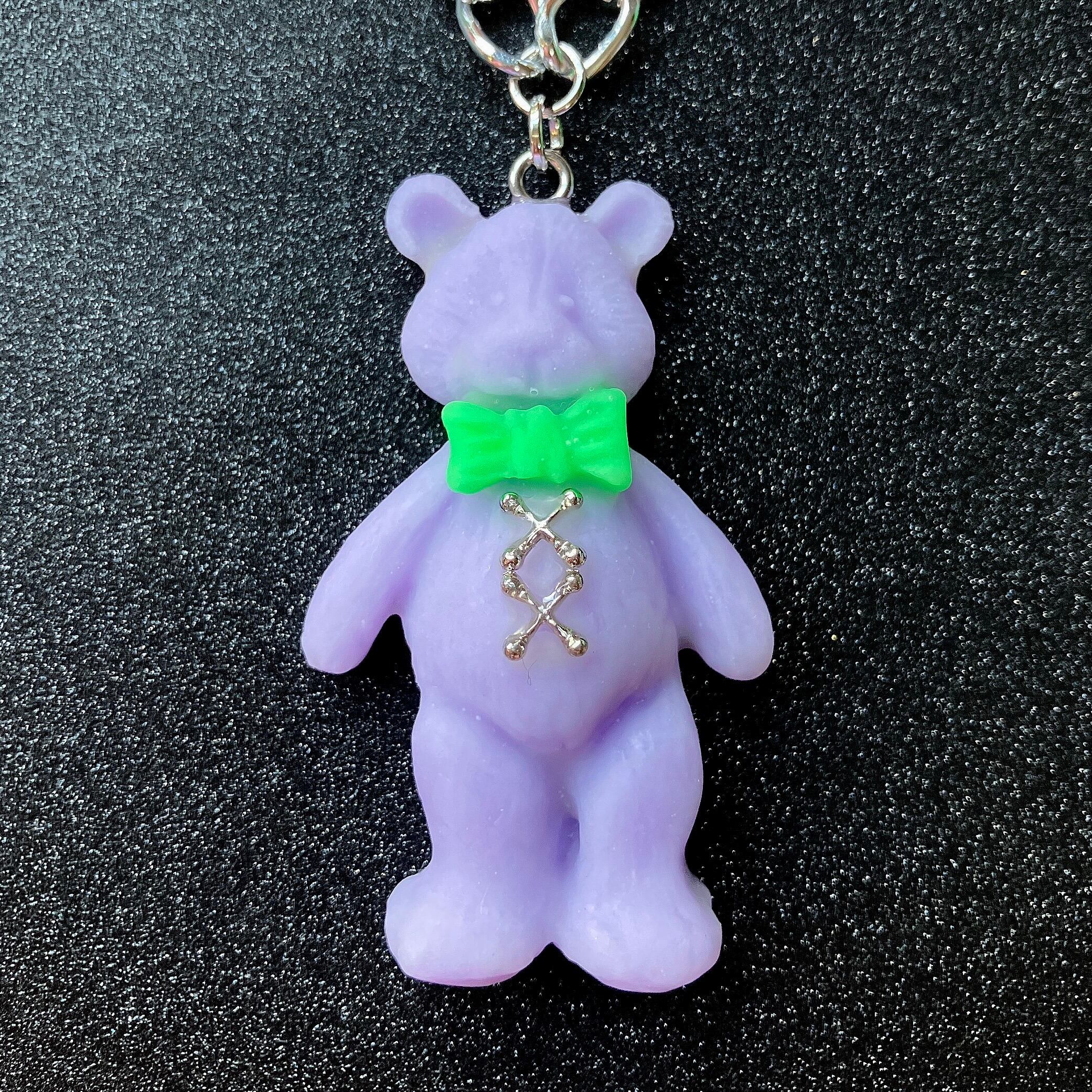 ハロウィンシーズンに向けて、蝶ネクタイを付けたモンスターカラーのくまがトップに揺れる、アルミチェーンネックレスです。