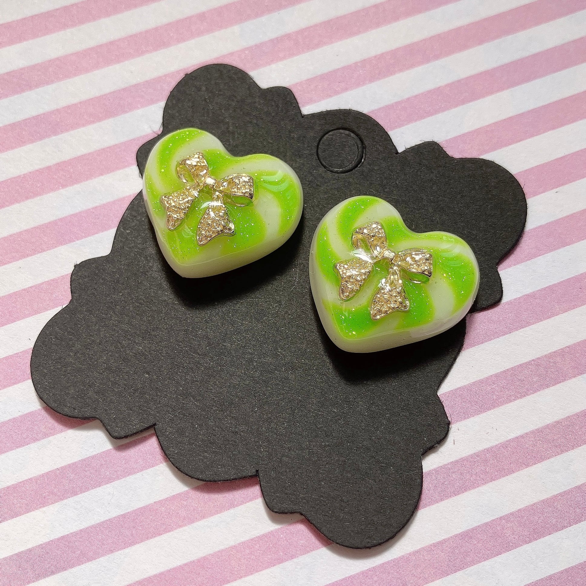 粘土製ハートににぐるぐるキャンディ模様を描いた新色は、ホワイトベースに、ラメ入りのライトグリーンでペイントしました。