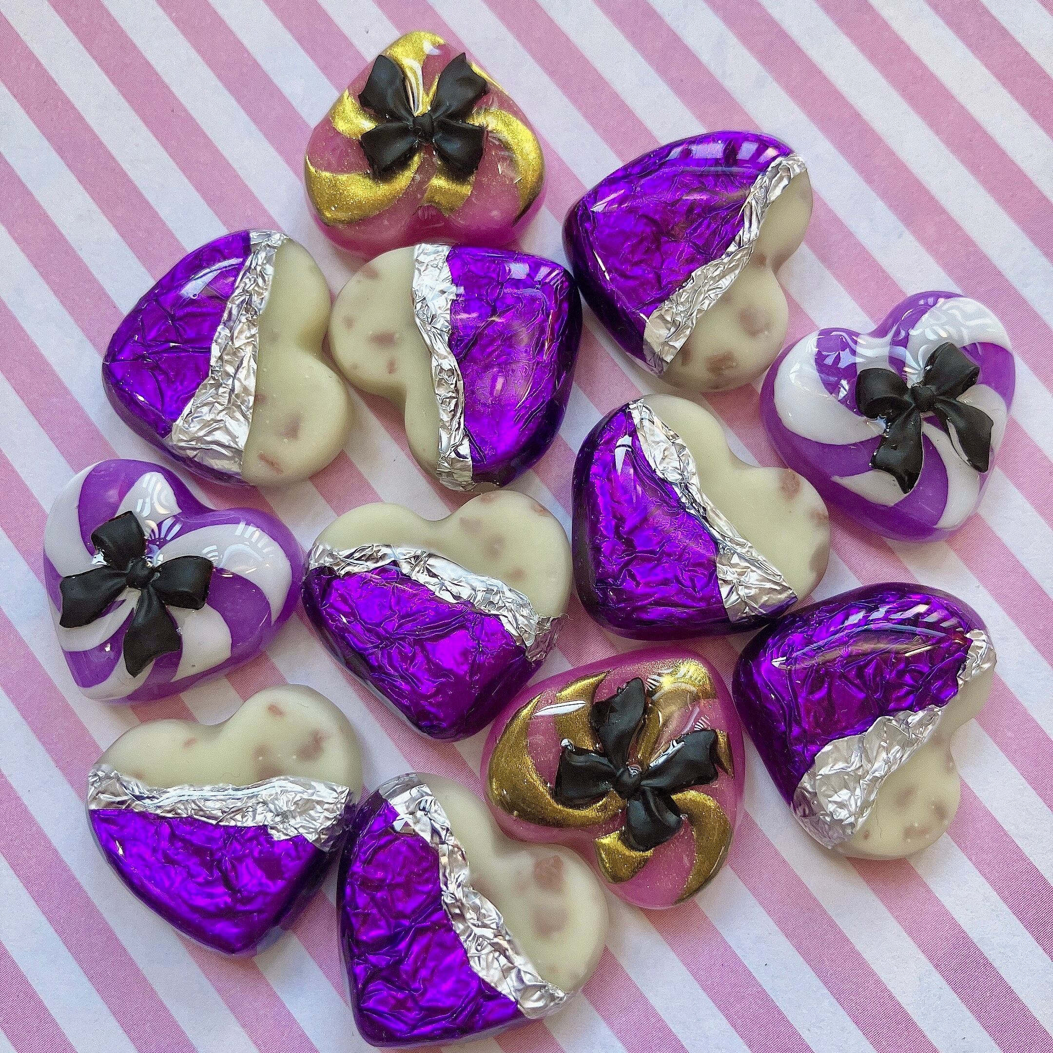 粘土製ハートににぐるぐるキャンディ模様を描いた新色は、パープルベースに、ホワイトでペイントしました。