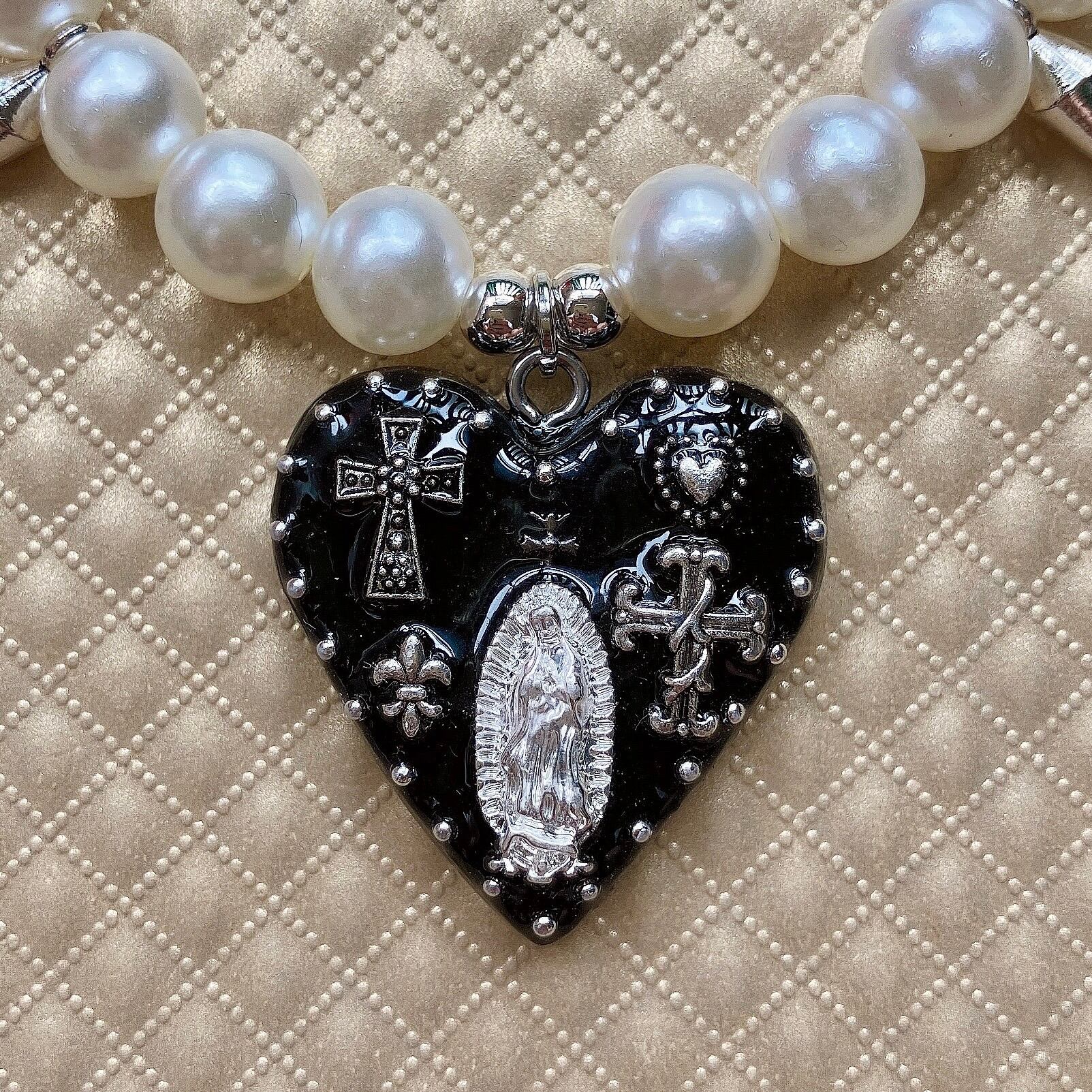 10mmパールと4つのトゲチャームはそのままに、昨年の秋冬同様ロンデルで挟んだデザインビーズを両サイドに1組ずつ通した形にこの秋冬は戻しました。(特に冬場は身に纏う物が厚く、色味も暗くなりがちな為、首周りが華やかになるように!)