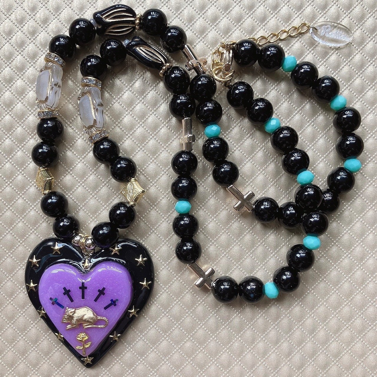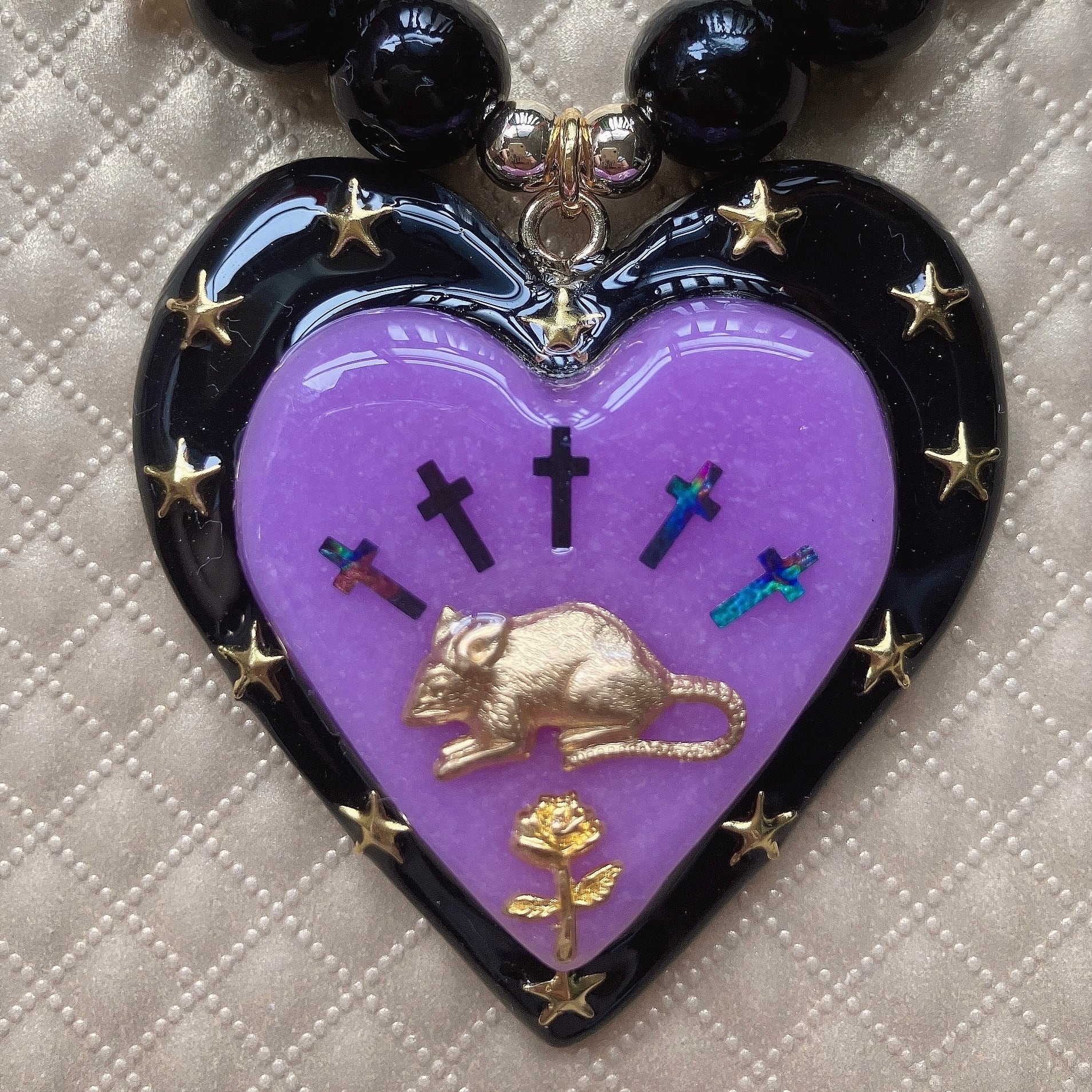 パープルのハートはブランドネームでもあるラットモチーフのUSA真鍮パーツを中心に装飾しており、下の黒いハートは星型メタルパーツで囲みました。(別名ラット教のネックレス)