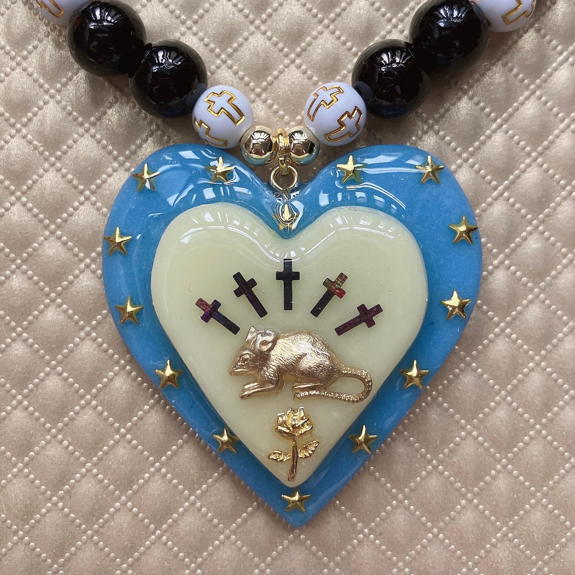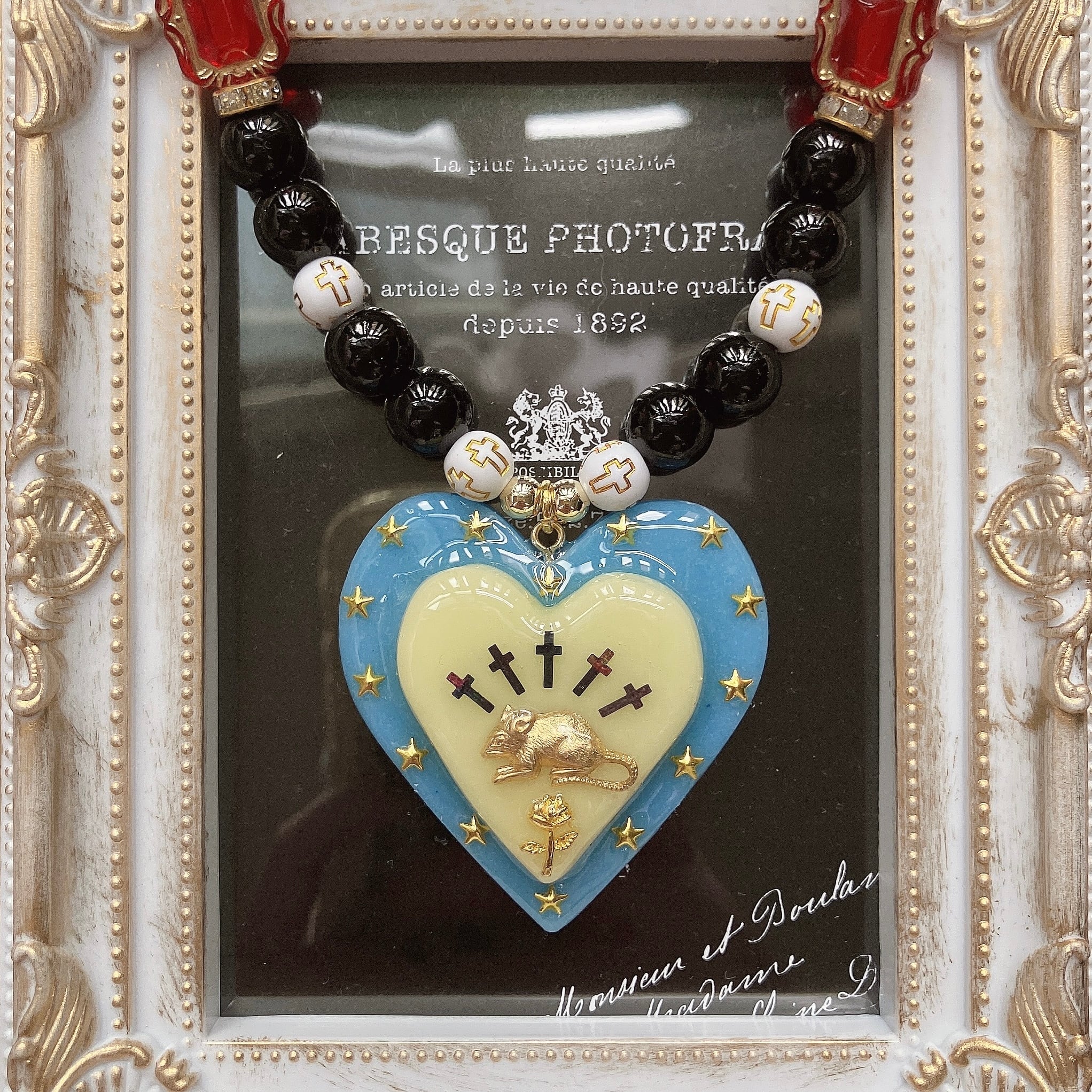 オフホワイトのハートはブランドネームでもあるラットモチーフのUSA真鍮パーツを中心に装飾しており、下の青いハートは星型メタルパーツで囲みました。(別名ラット教のネックレス)