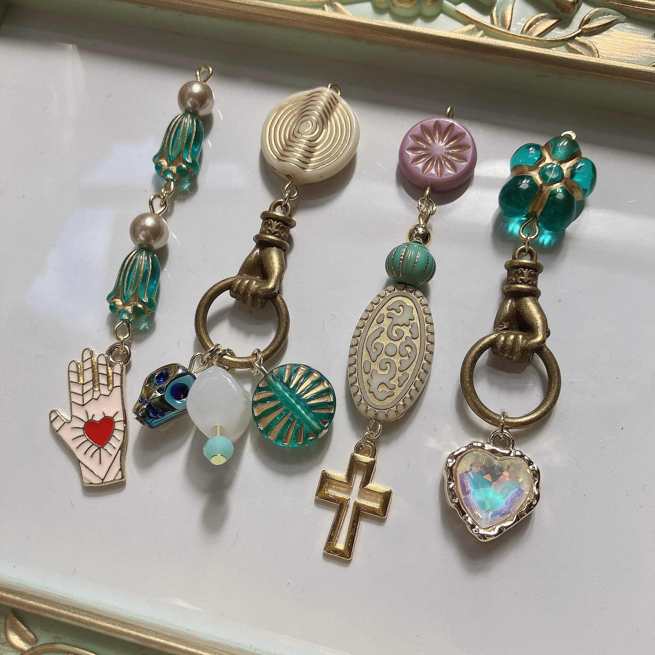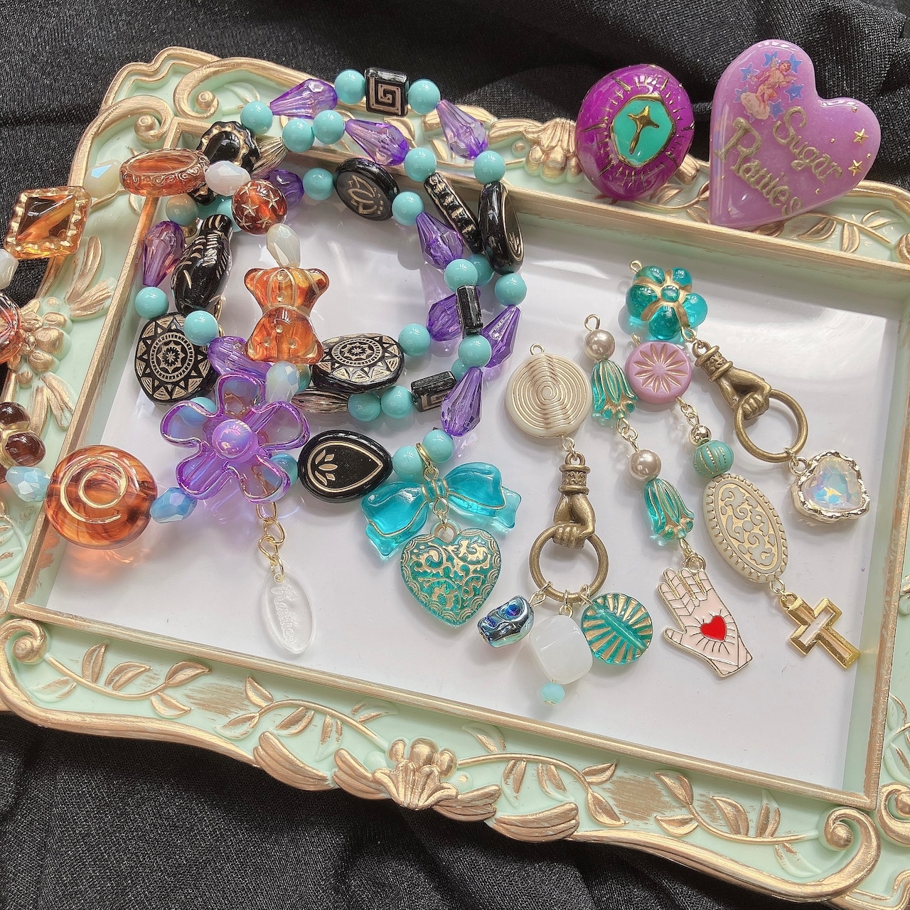 ひとつひとつのビーズやパーツはそれぞれ異なりますが、全体の雰囲気が合うようにセットを組みましたので、どれとどれを組み合わせても大丈夫です。