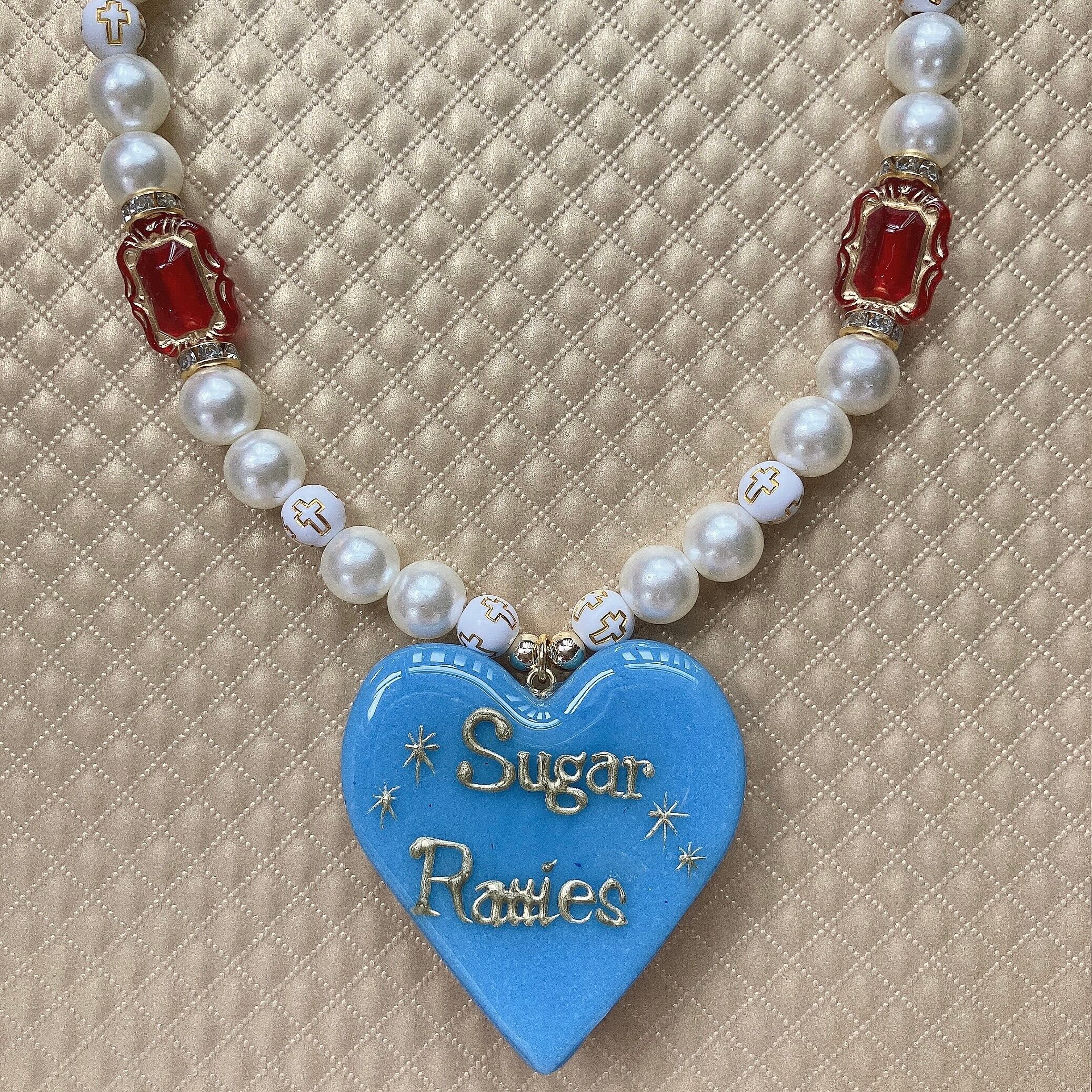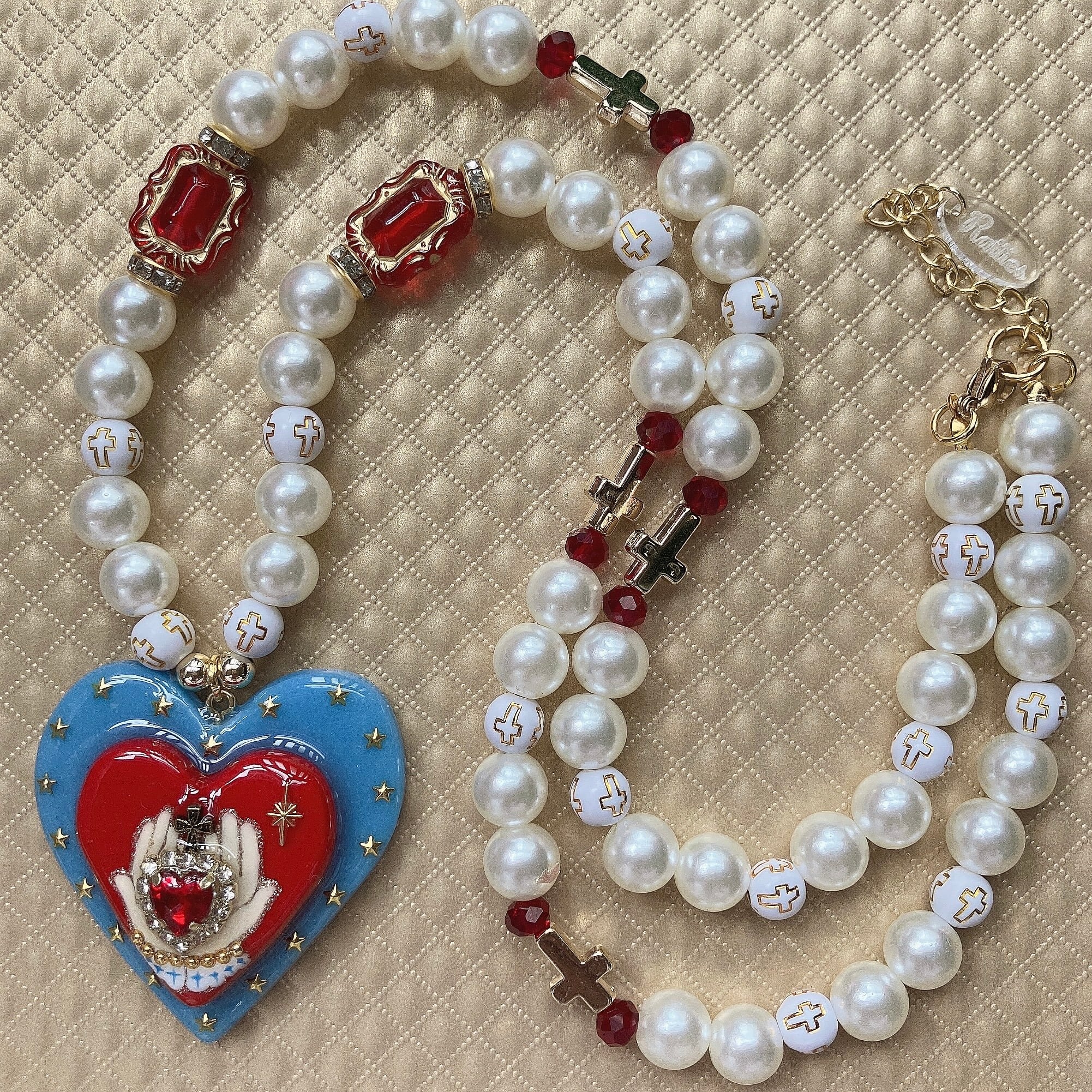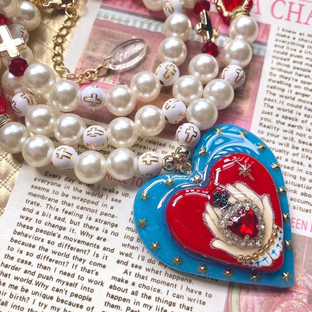 星のスタッズで囲んだ青いハートに、ハンドモチーフを描いた赤いハートを重ねたダブルハートは、ストーンやメタルパーツで飾り付け華やかに。