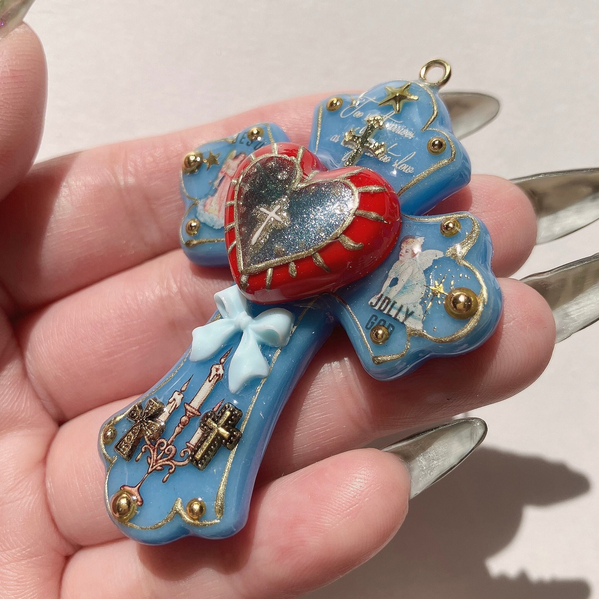 天使や燭台、英字の背景デザインにリボンや十字架、星でデコレーションした粘土製のトップになります。