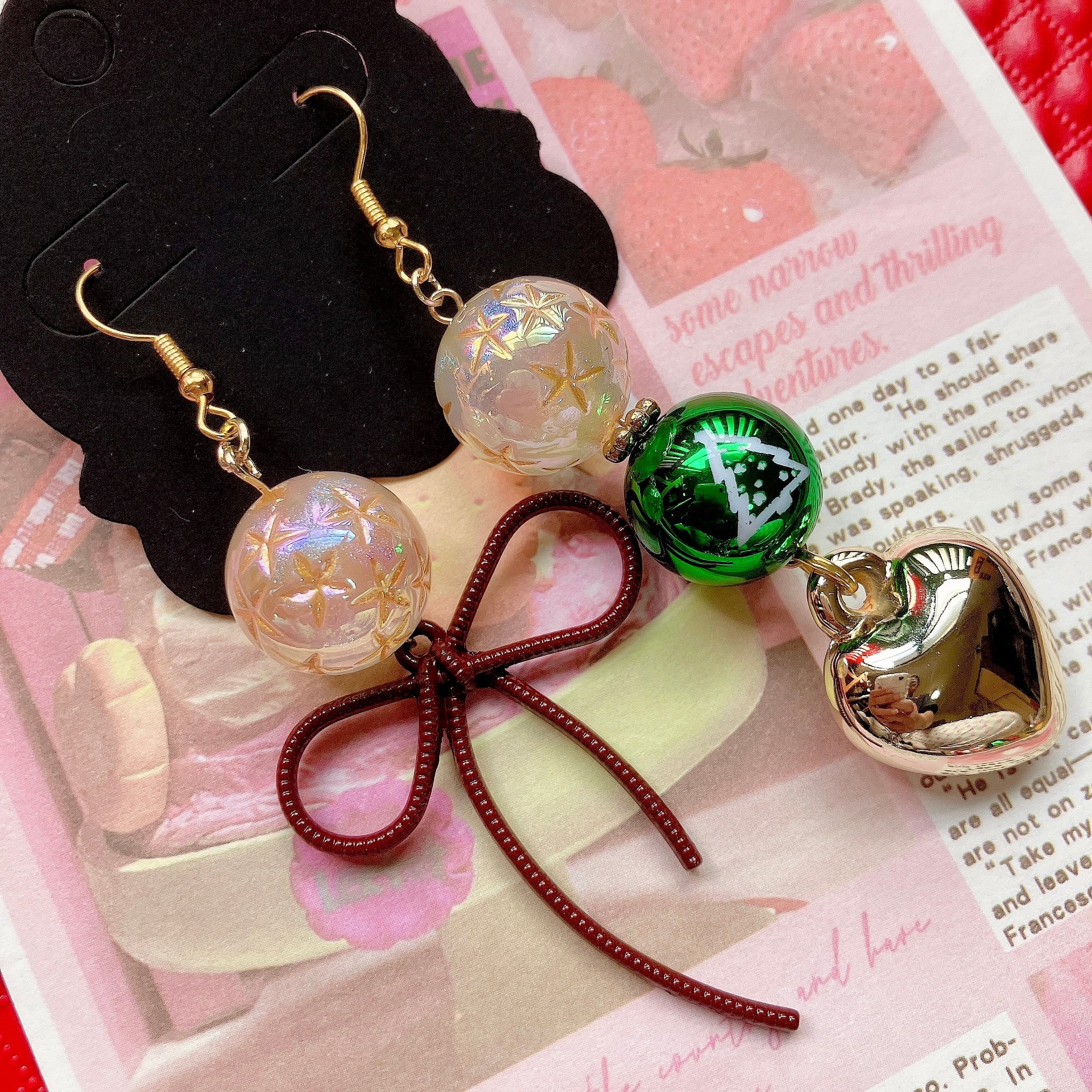 星が描かれたオーロラボールやツリーが描かれたメタリックグリーンのボールビーズ、深みのある赤いリボン、メタリックゴールドのハートを組み合わせた左右デザイン違いのイヤーアクセサリー。