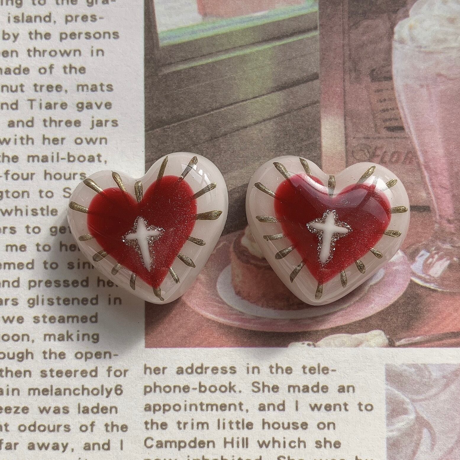後光がさす十字架を描いた粘土製ハートの御守り的アイテムです。