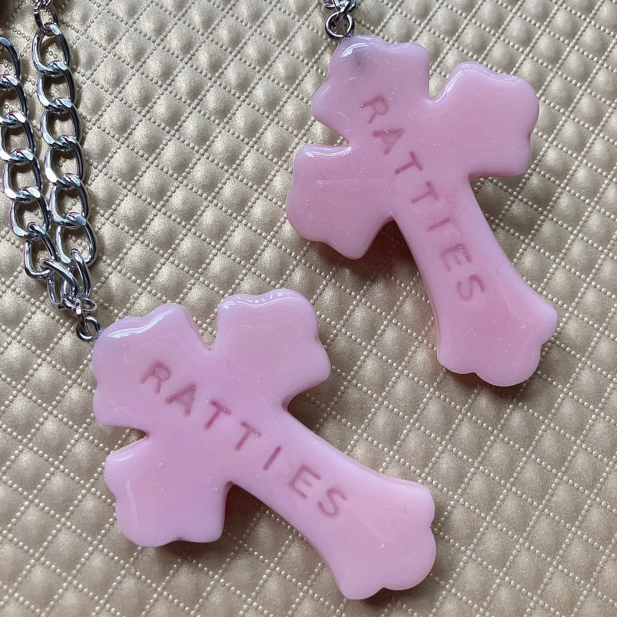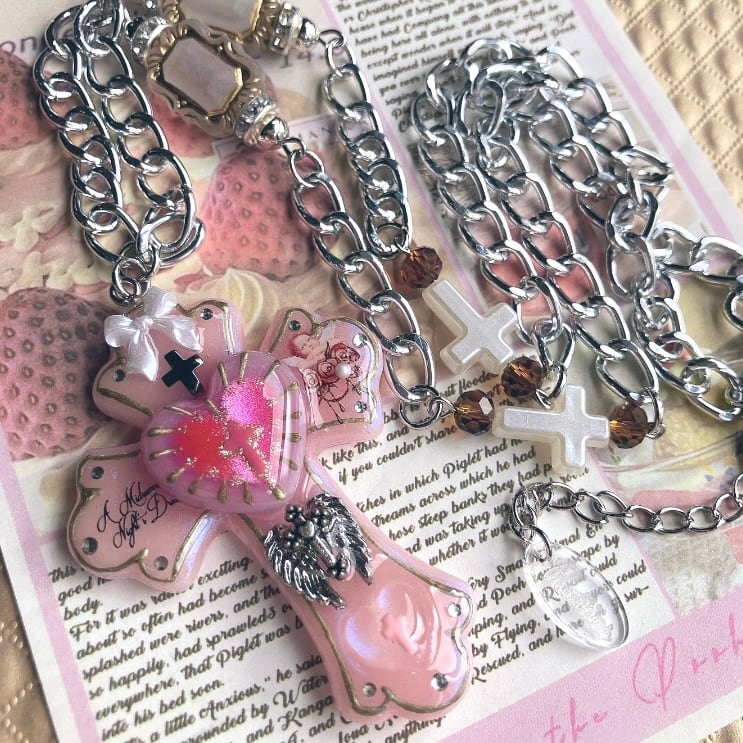 SUGAR RATTIESの定番品、手描きの絵柄が入ったアミュレットハートをドッキングさせた十字架は、縁の手描きラインに加え、ハートと重ねているため厚みと見た目の重厚感があります。