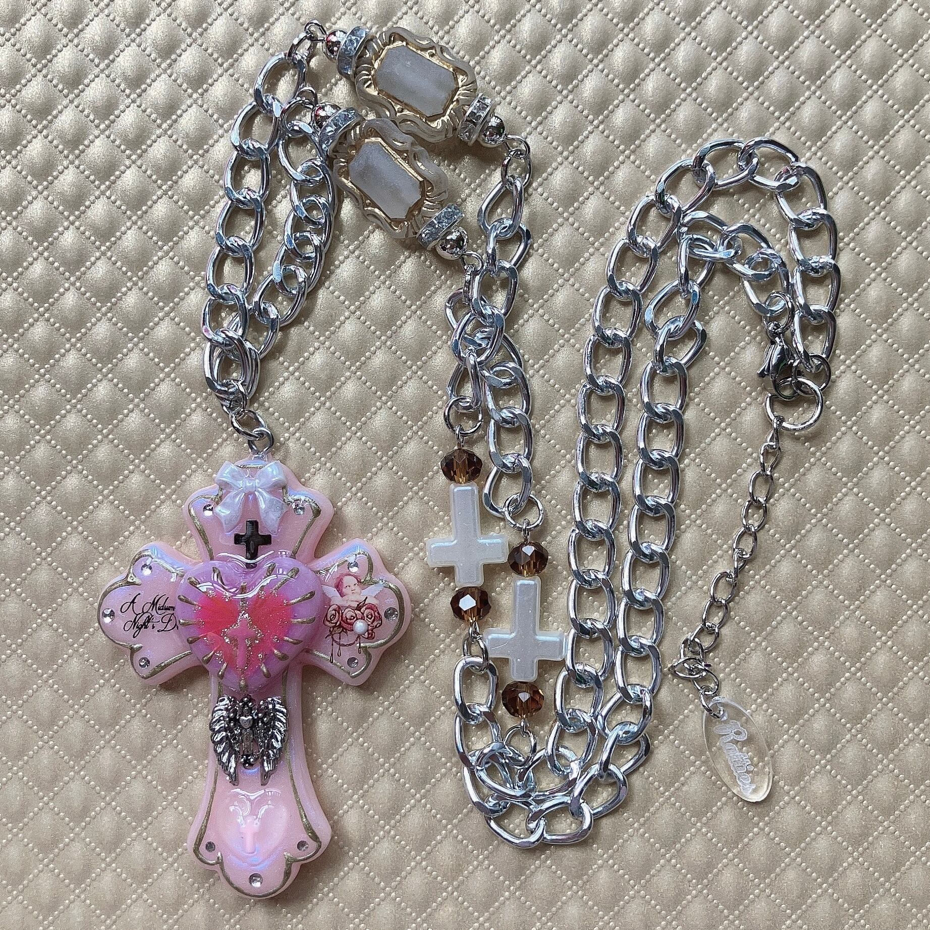 ロングチェーンはロンデルで挟んだデザインビーズや、ガラスビーズで挟んだ十字架ビーズがポイントになり、単調になりすぎないデザインです。