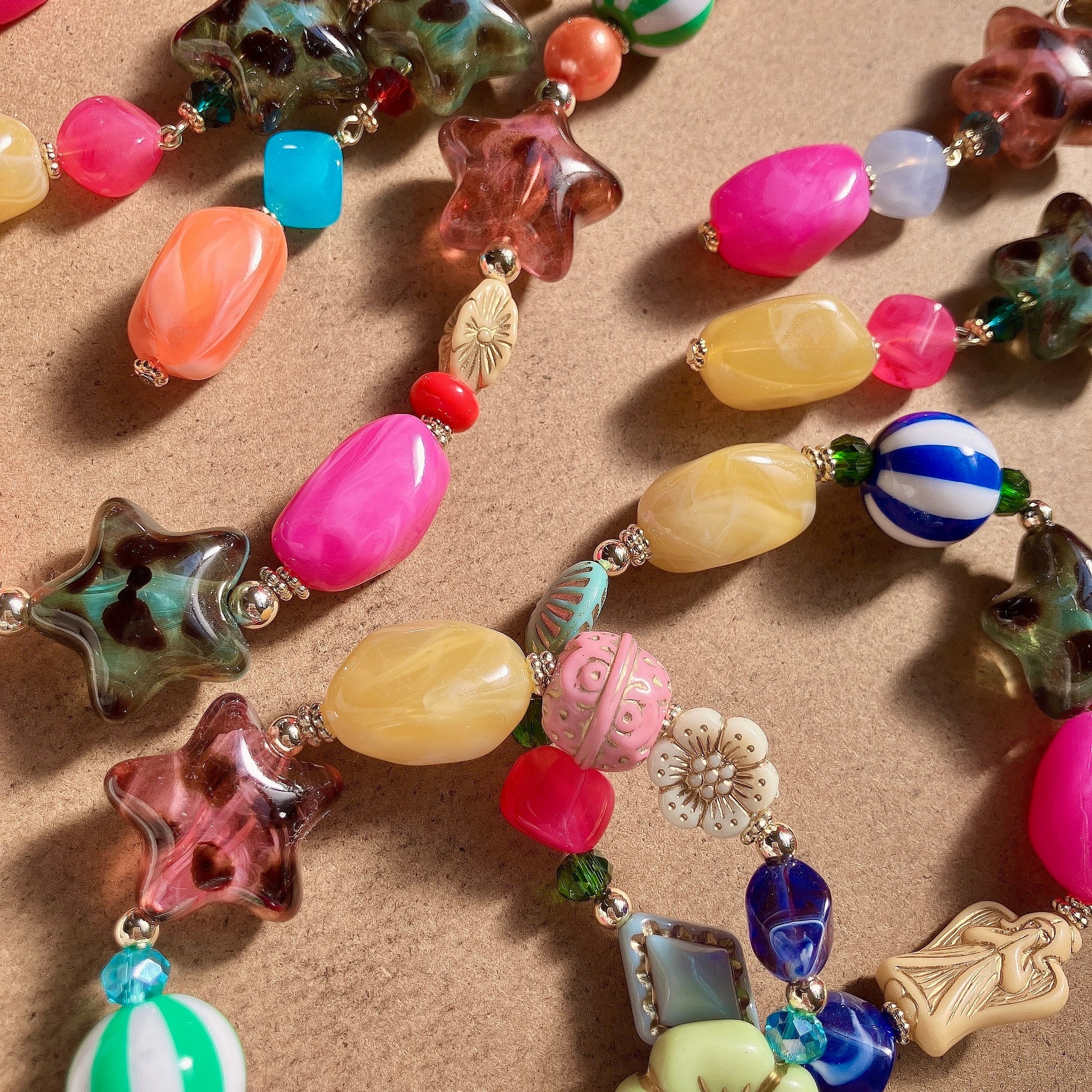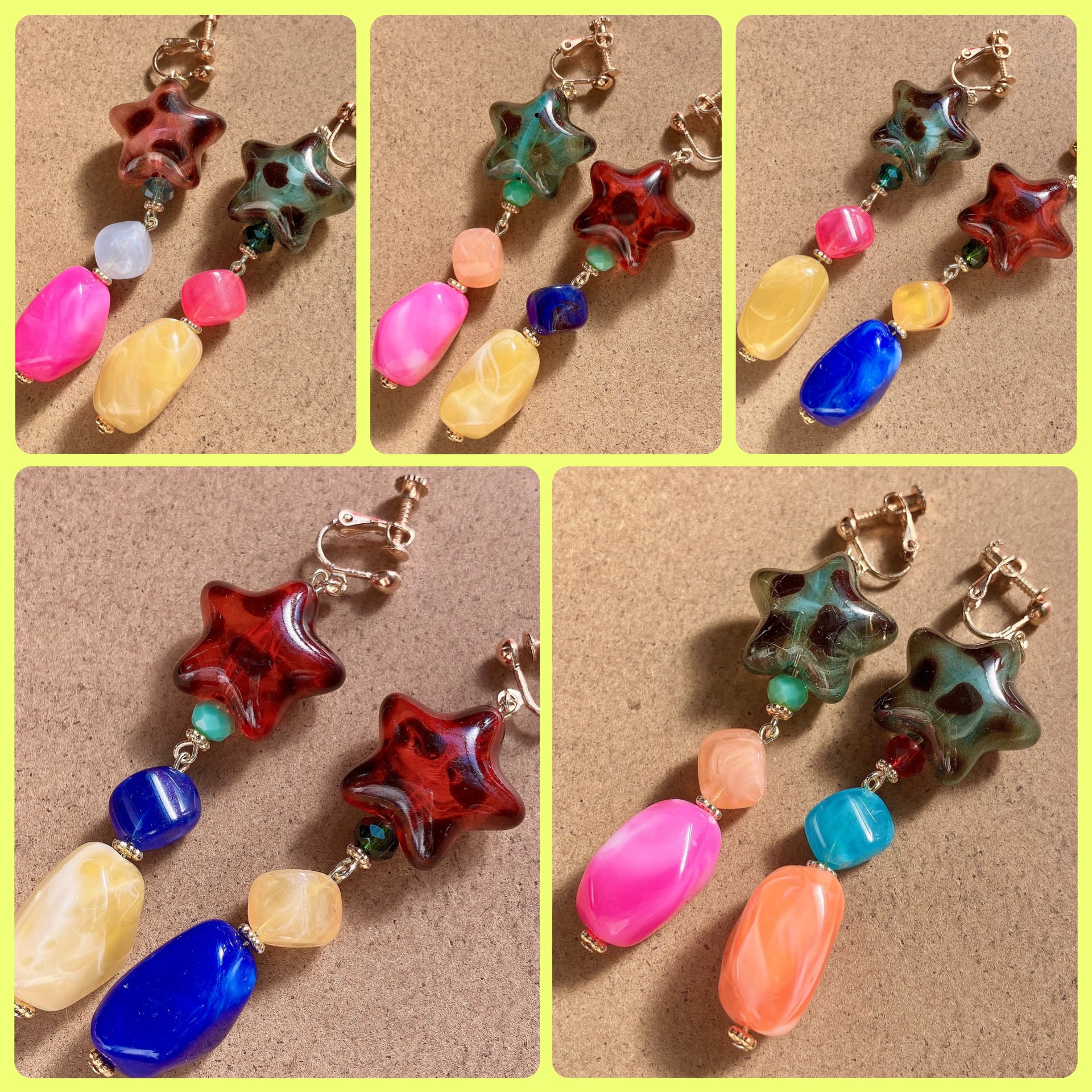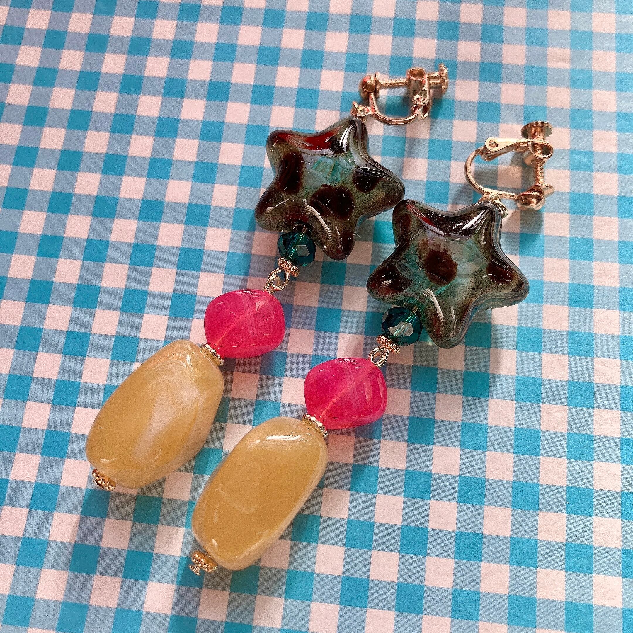 レオパード柄の星型ビーズに、キャンディみたいな大小のビーズを組み合わせたピアス、イヤリングです。