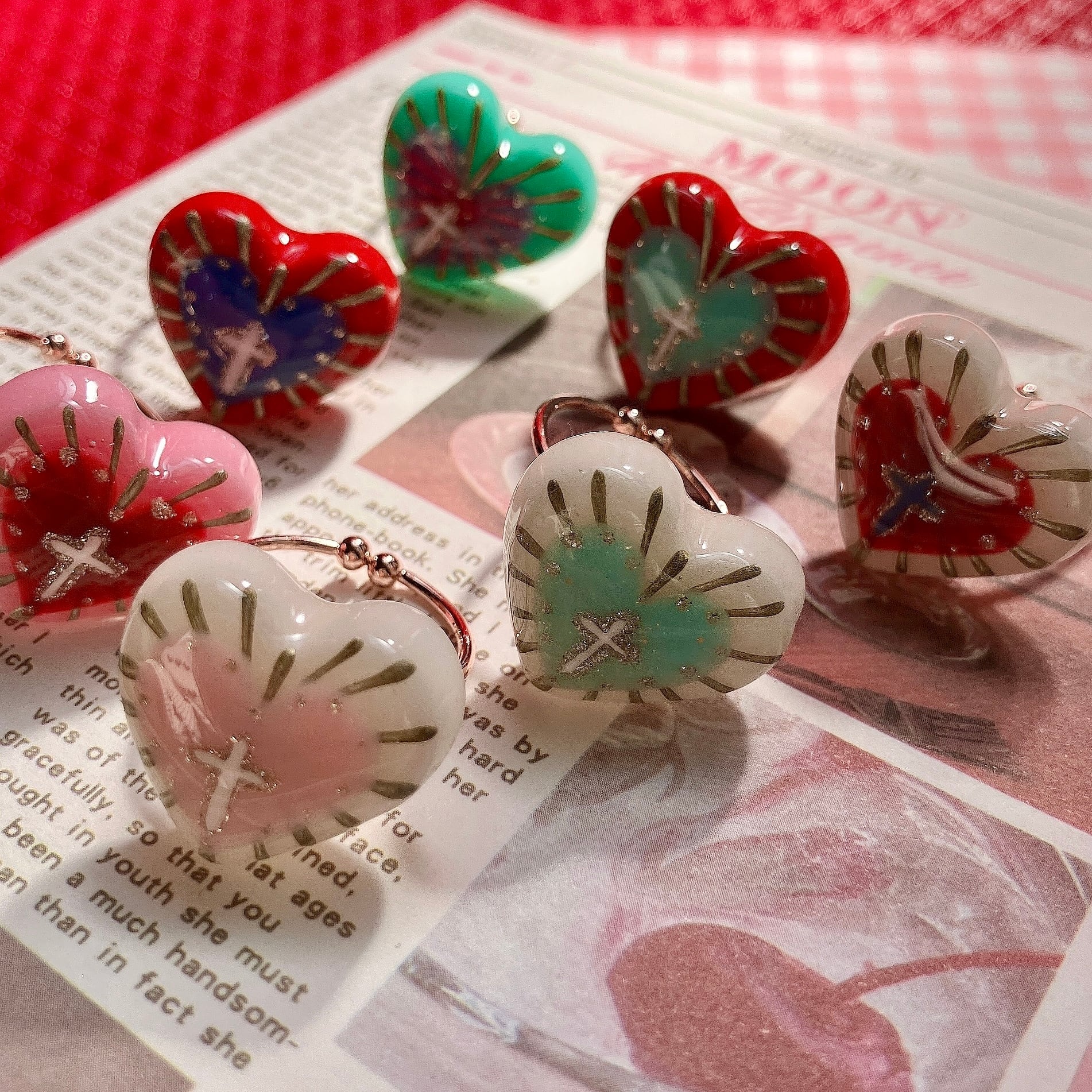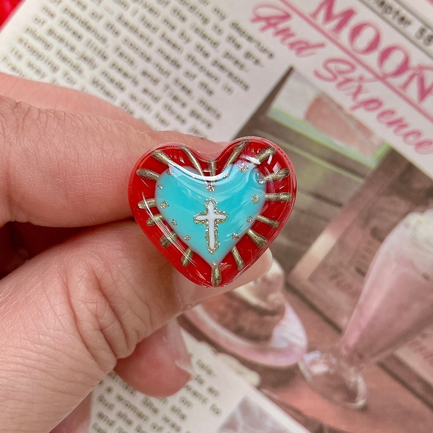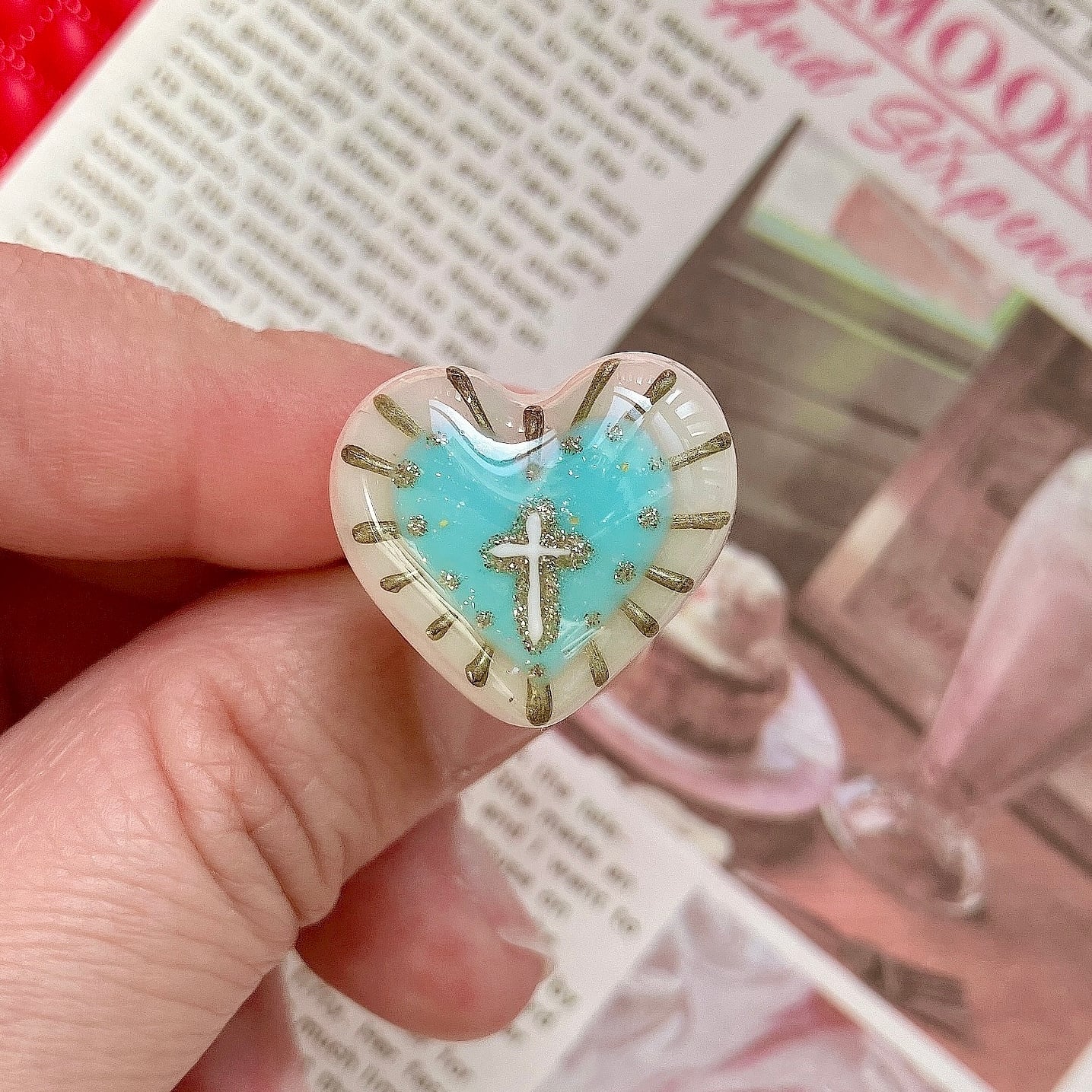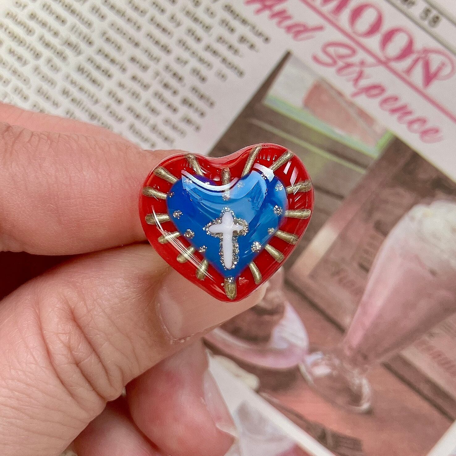 粘土で作ったハートに後光がさす十字架を描いた御守り的アイテムです。