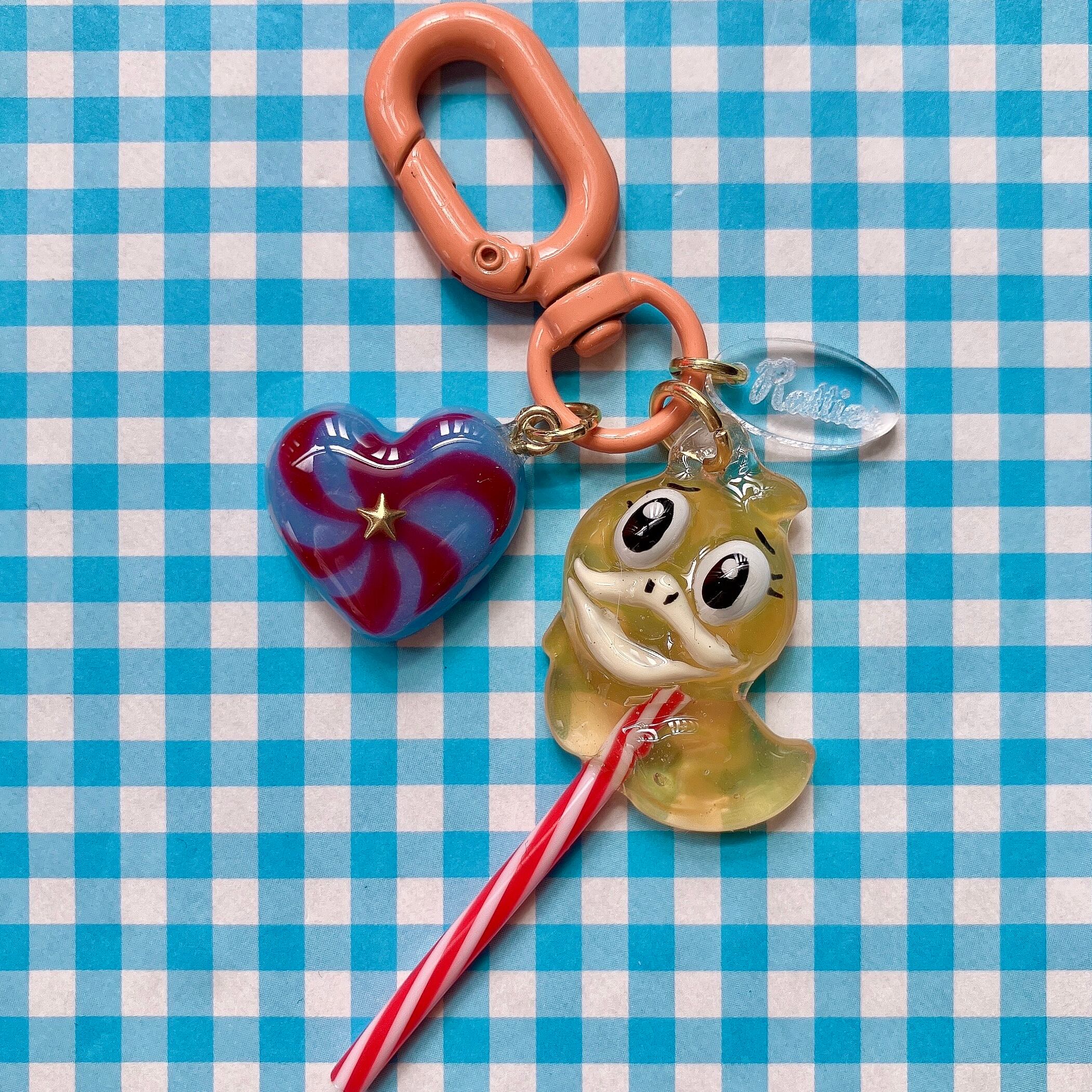困り眉のアヒルちゃんロリポップキャンディとハートのぐるぐるキャンディに、ブランドタグがついたキーチャームです。