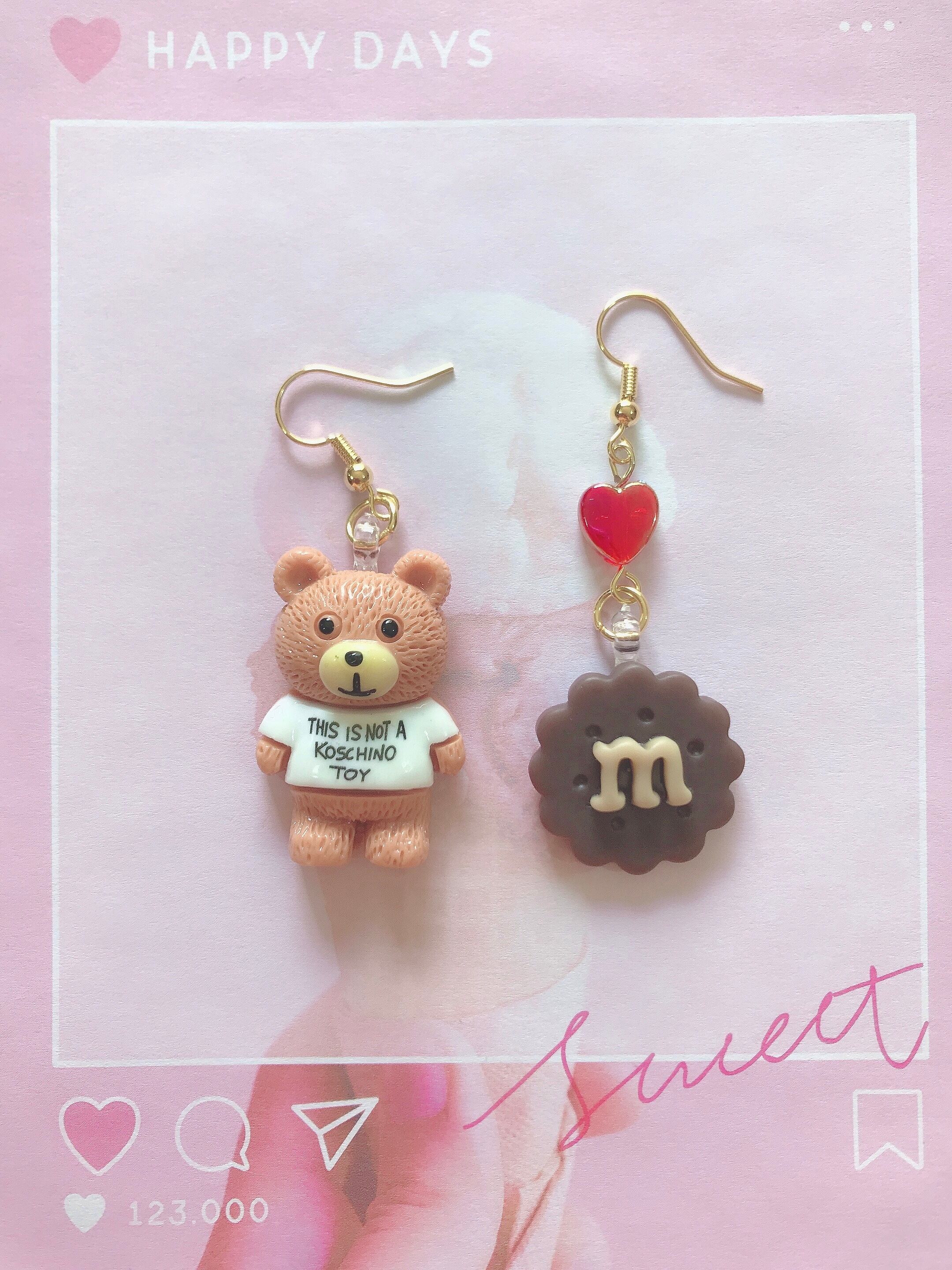 Tシャツを着たテディベアのピアスと、mマークのビスケットにオーロラハートビーズをくっつけたピアスの、左右デザイン違いとなります。