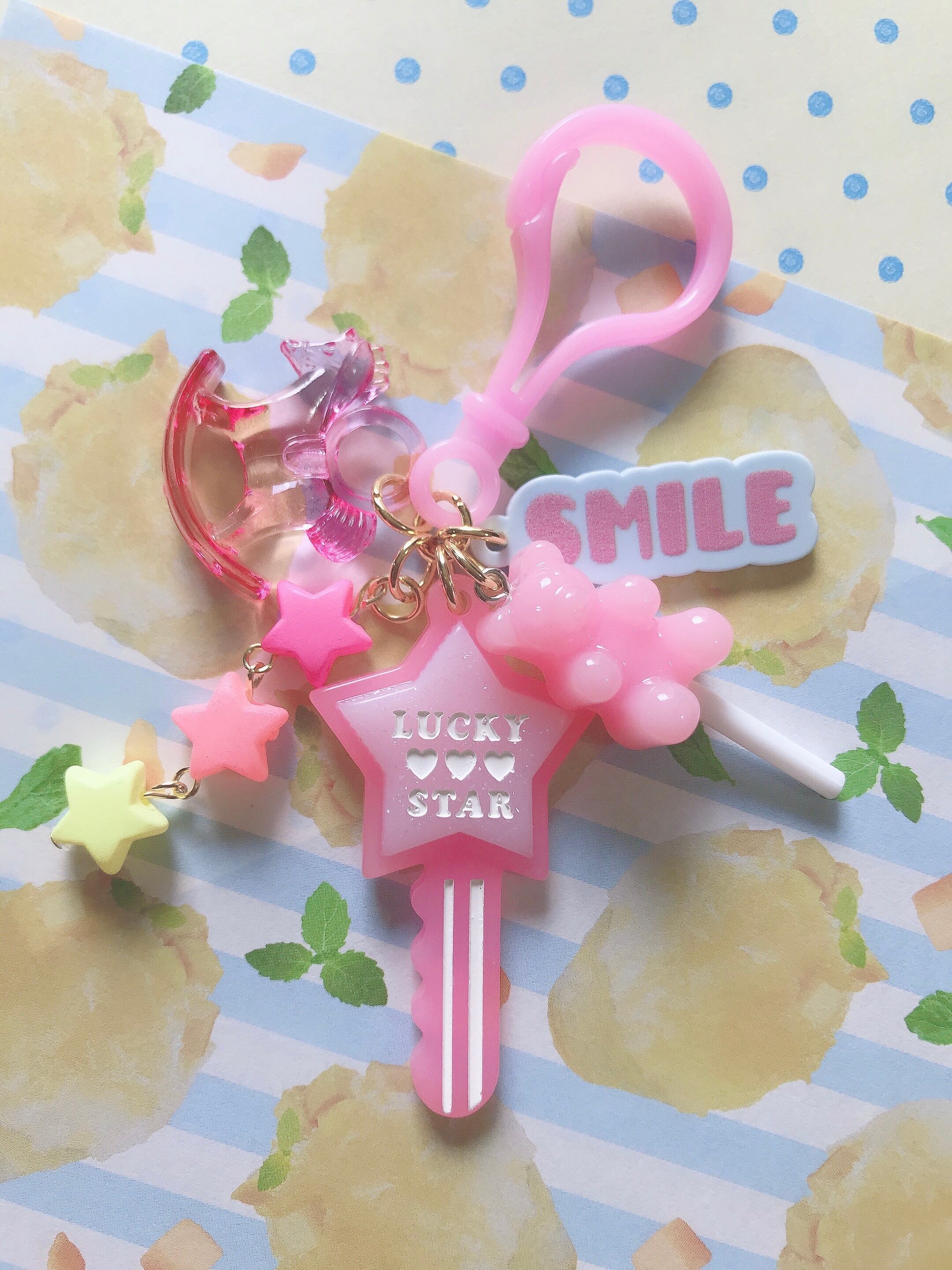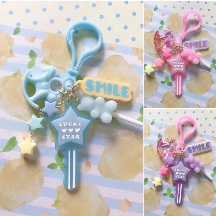 星型の鍵やクマさんのロリポップキャンディ、木馬や『SMILE』ロゴプレートが付いたキーホルダーです。