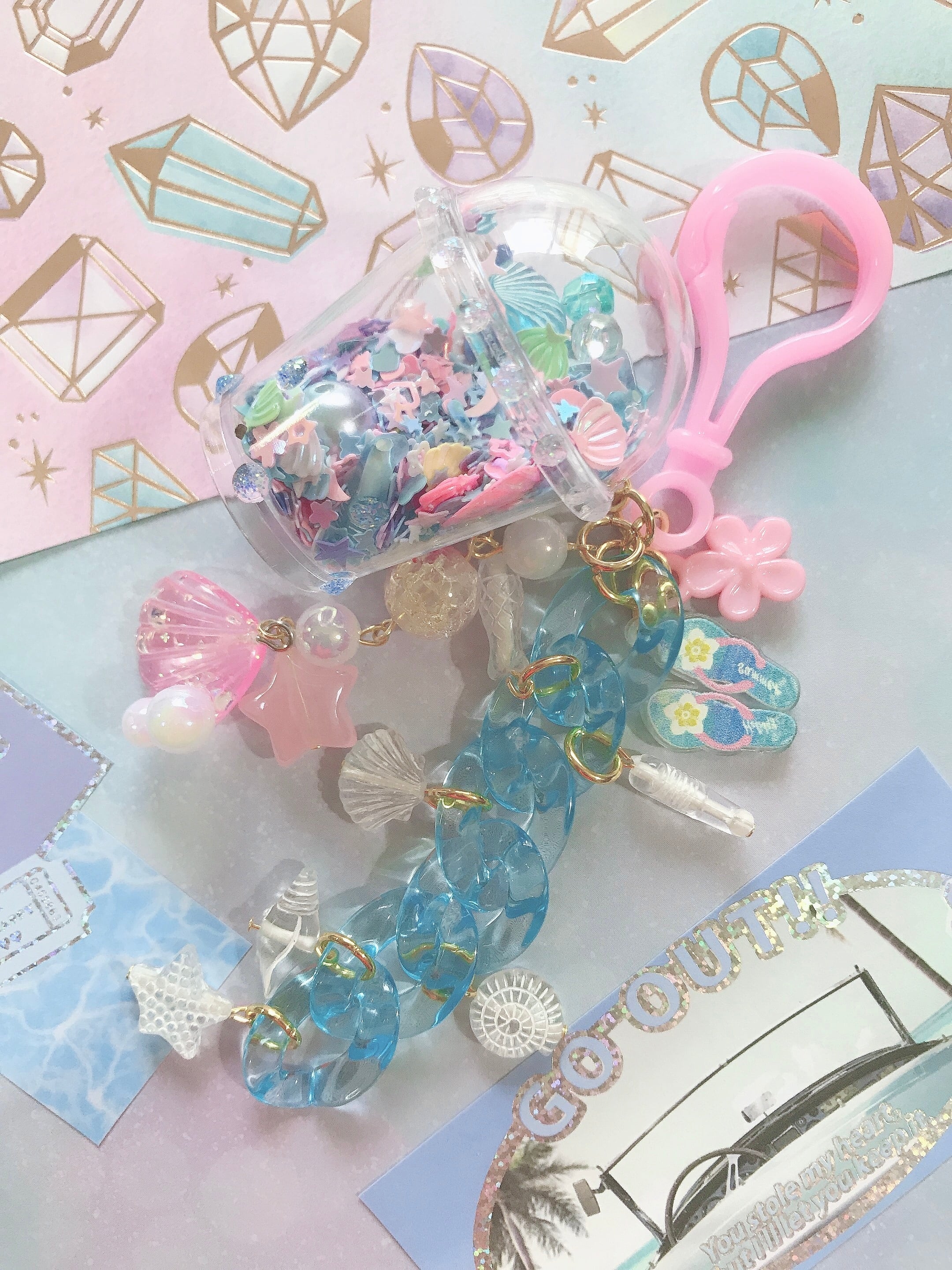真珠貝やビーチサンダルのチャームも付いて、夏にピッタリのキーホルダーです♡