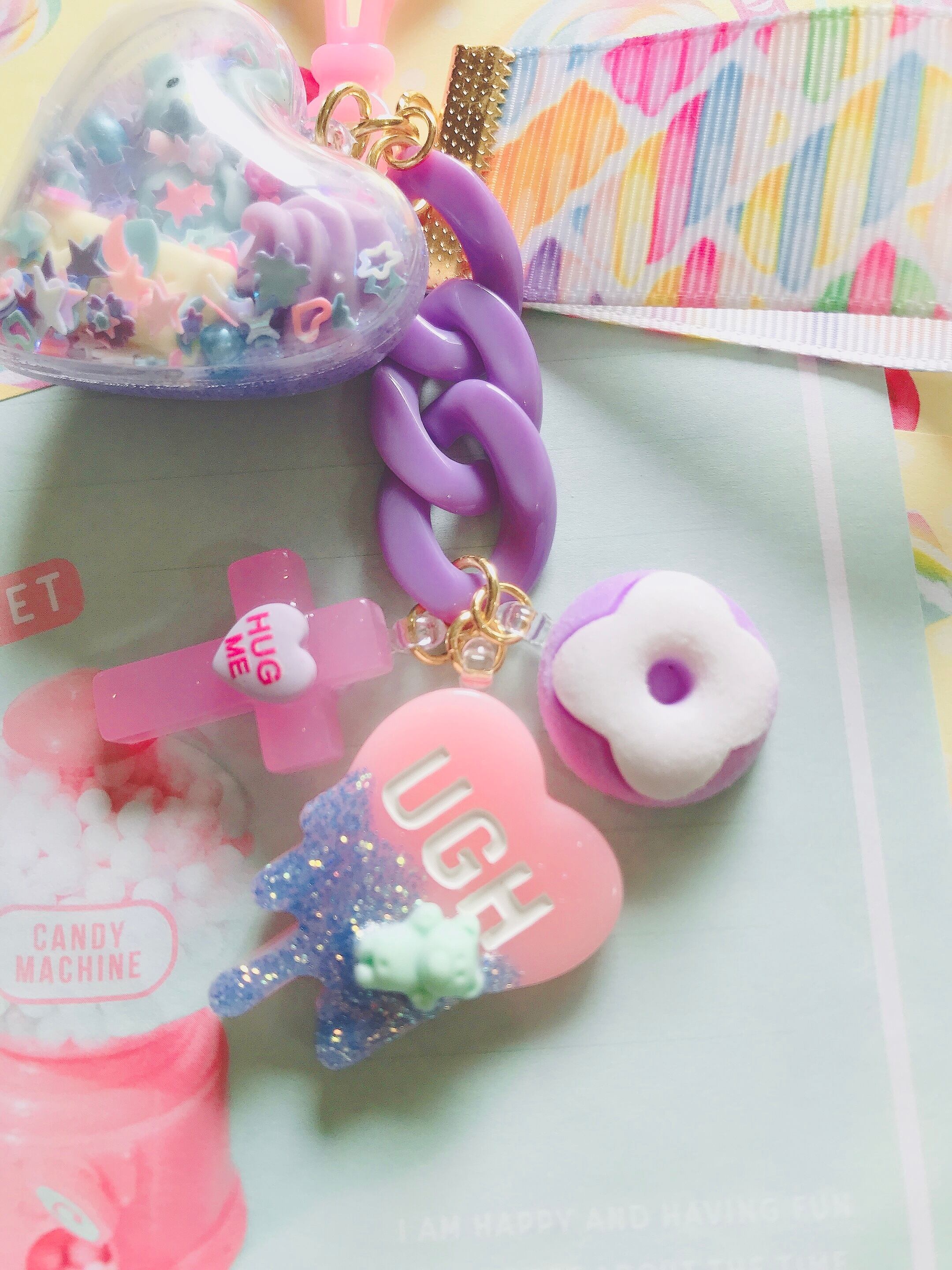 BIGサイズのハートカプセルやザラメドーナツグミ、ドロドロハート、キャンディハーツの十字架チャーム、マシュマロ柄のリボンが付いたキーホルダーです。