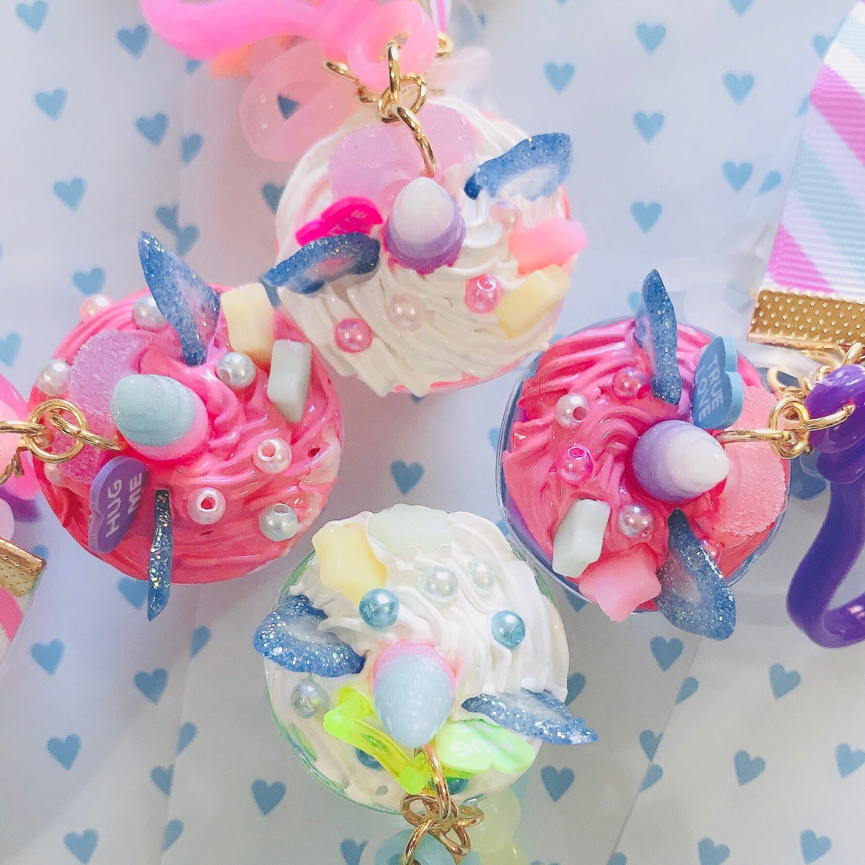 パフェグラスにビーズを2層のジャムで閉じ込め、ホイップクリームで蓋をし、ユニコーンの角や耳で飾り付けたユニコーンパフェのキーホルダーです。