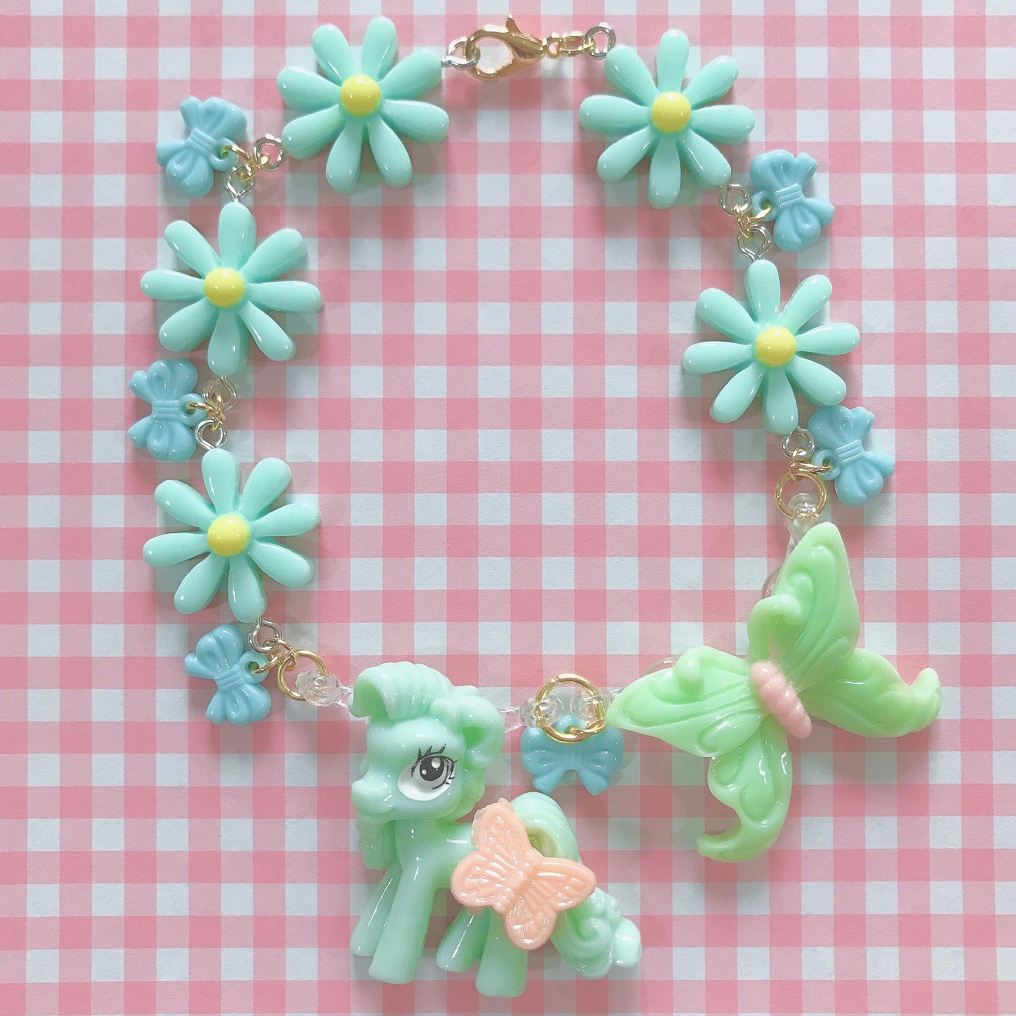 おしりに蝶々がとまったポニーと大きな蝶々をメインに、お花の間を小さなリボンで飾り付けたバッグチャームです。
