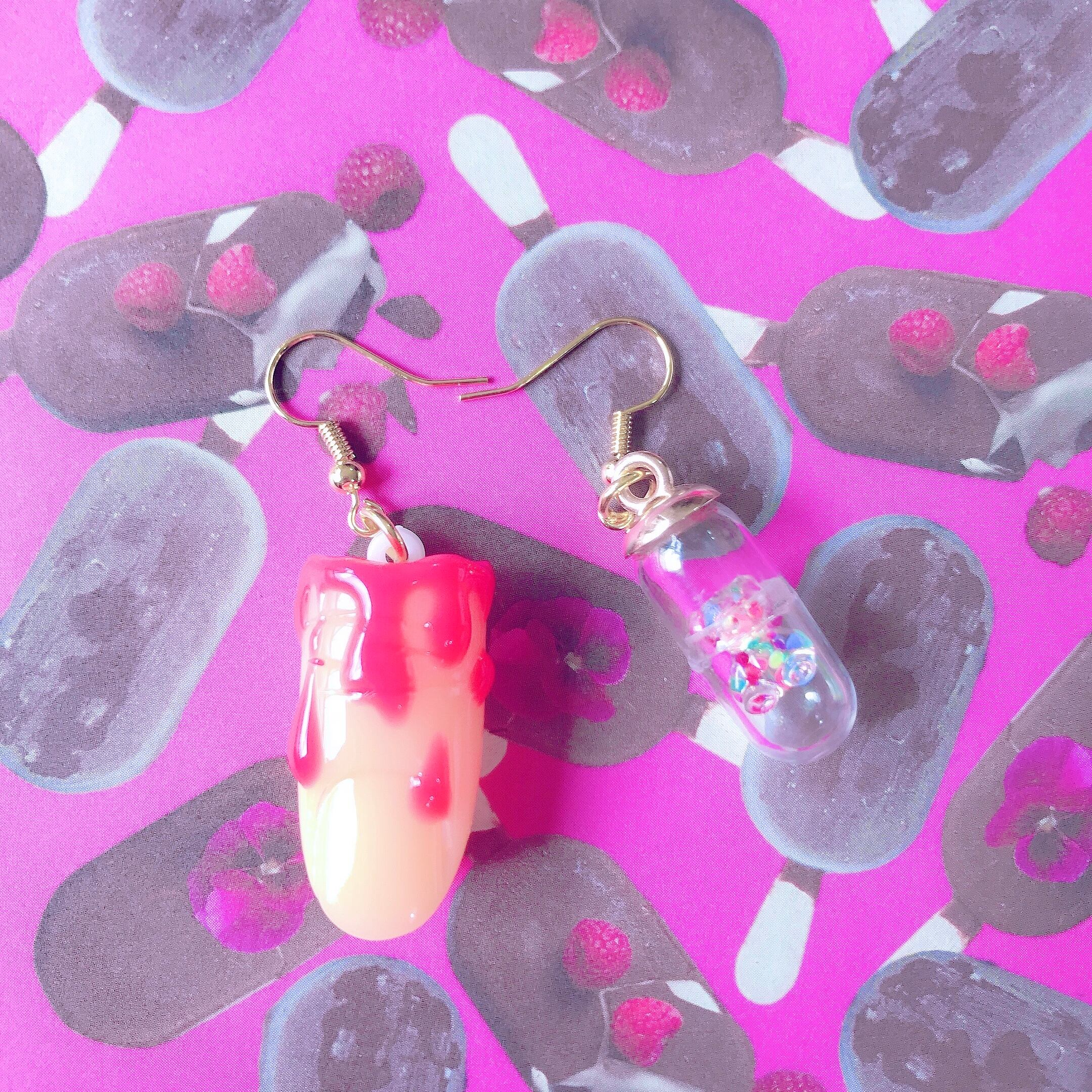 血に見立てた赤いジャムが垂れる指と、ホロ入りクマが入ったカプセルの左右デザイン違いのピアス。