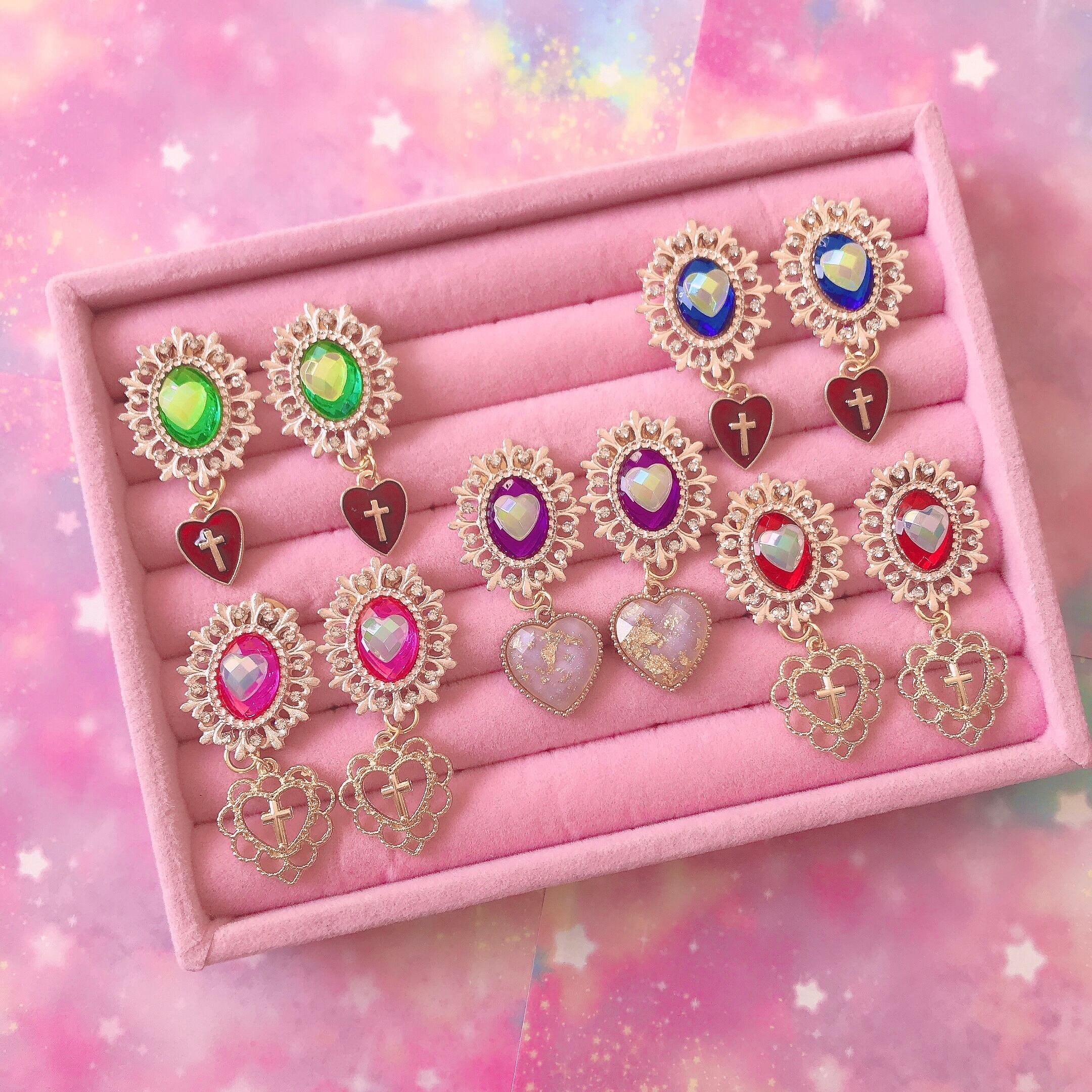 大ぶりのビジューに多面カットのハートをのせた、きらめく魔法の鏡から連なるハートチャームが揺れるピアスです。