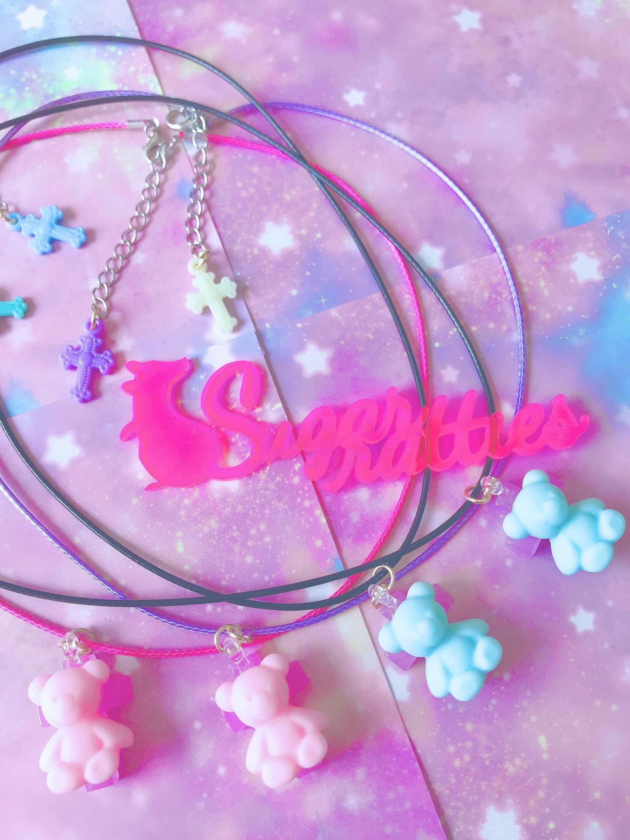 スケルトンカラーの十字架に磔られクマのトップが揺れるチョーカーです。