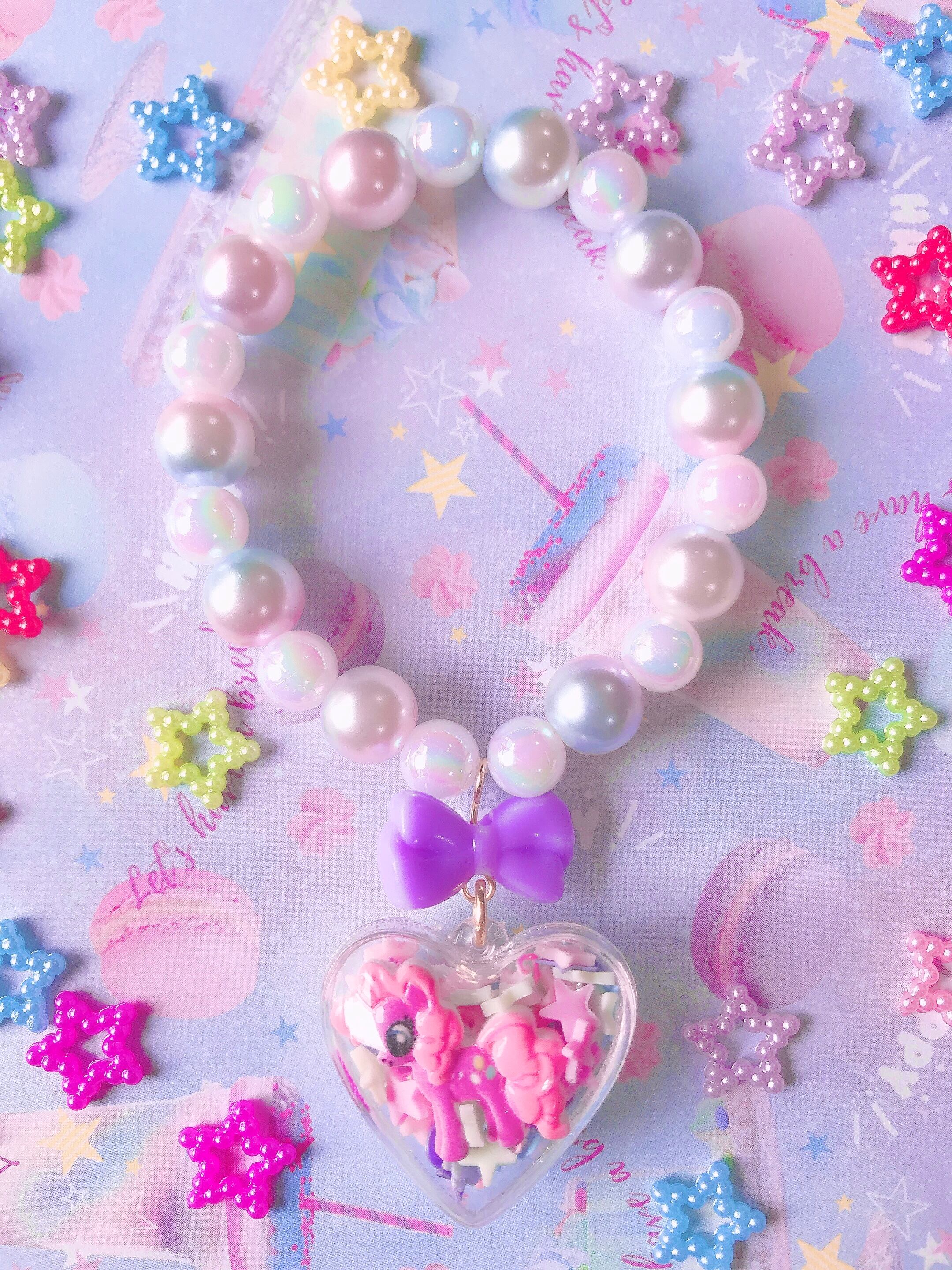 小さなポニーと雲や星屑のフレークパーツを詰め込んだシャカシャカハートカプセルチャームが揺れるビーズブレスレット。