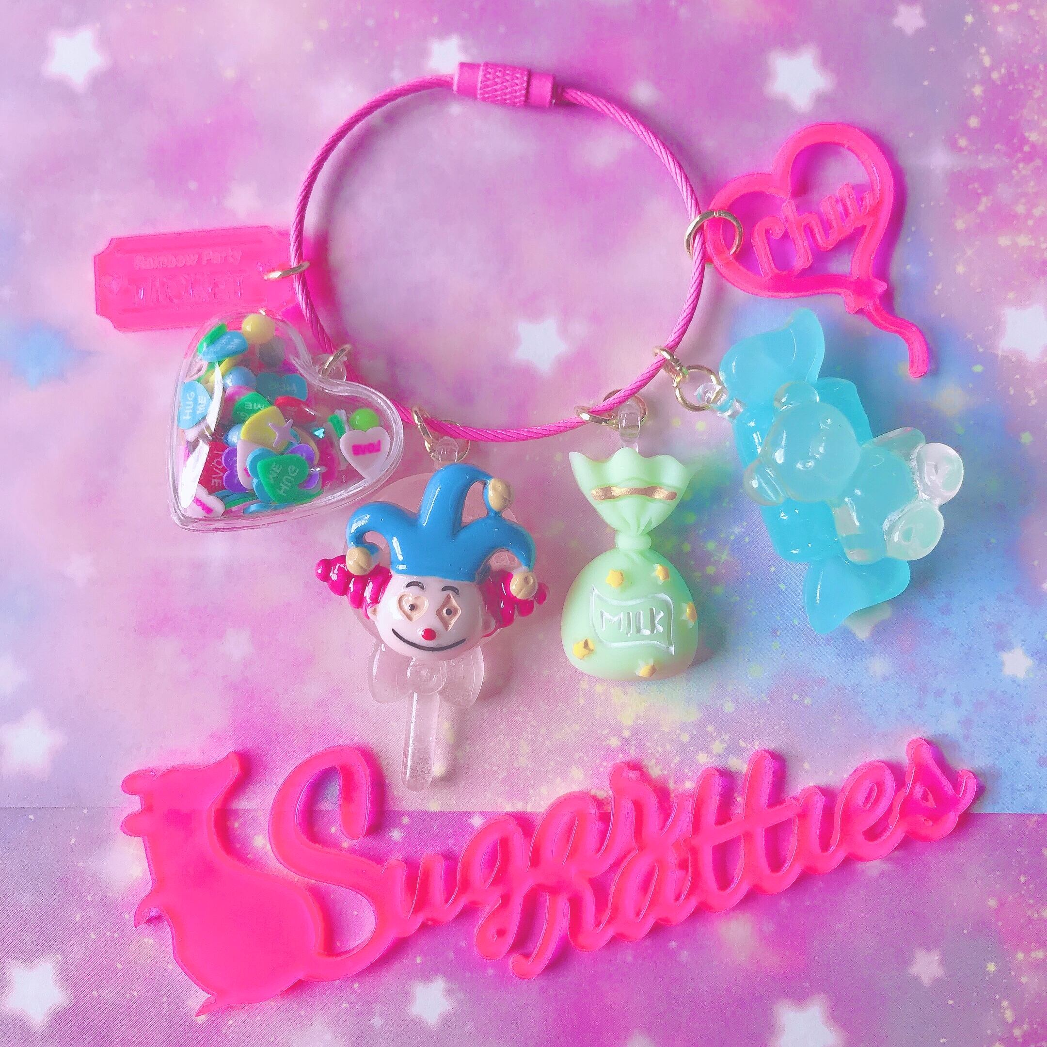 ピエロのぐるぐるキャンディやクマをのせたキャンディ、絞り袋のキャンディ、ピエロに合わせたハートのバルーンチャーム、パーティっぽさ全開のフレークパーツ、チケットチャームも付いており、ピエロのパーティに招待されているようなイメージです★