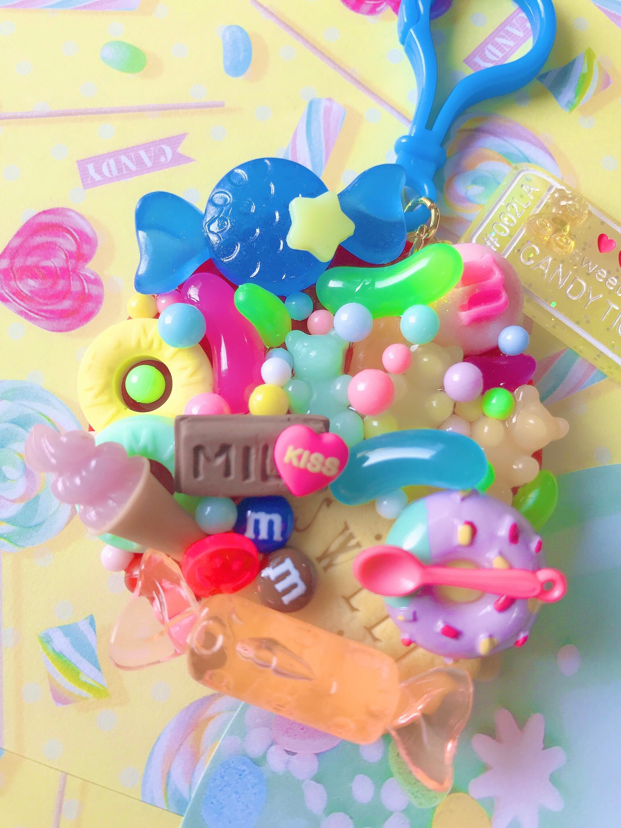 キャンディやビスケット、ジェリービーンズにチョコレートなど甘いお菓子を敷き詰めたデコプレートキーホルダー☆
