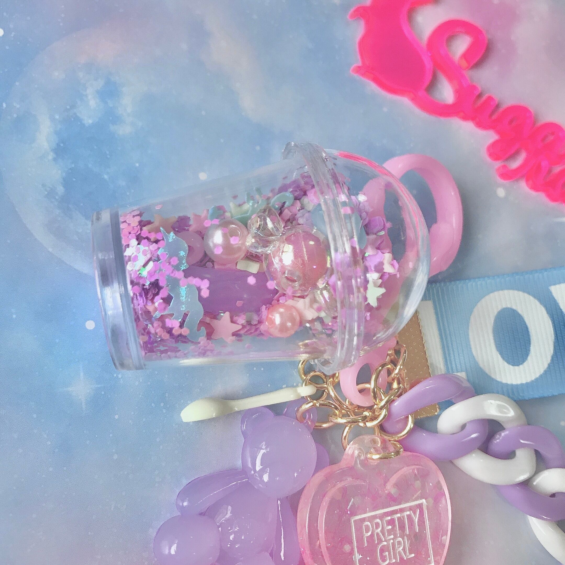 スケルトンベアと透明なハートの鍵、『LOVE』ロゴリボン、プラチェーンが揺れるミニスプーン付きのドリンクカップキーホルダー。
