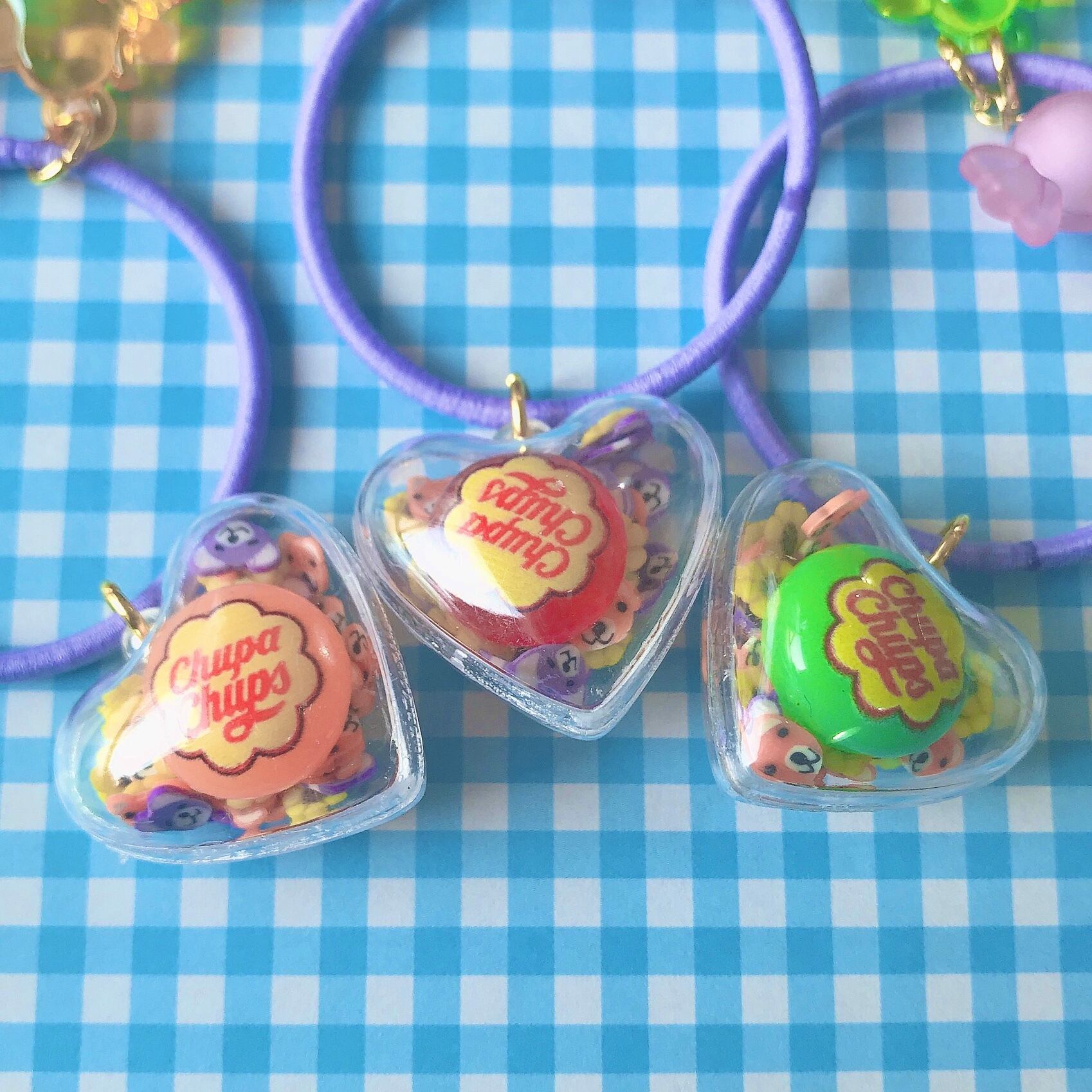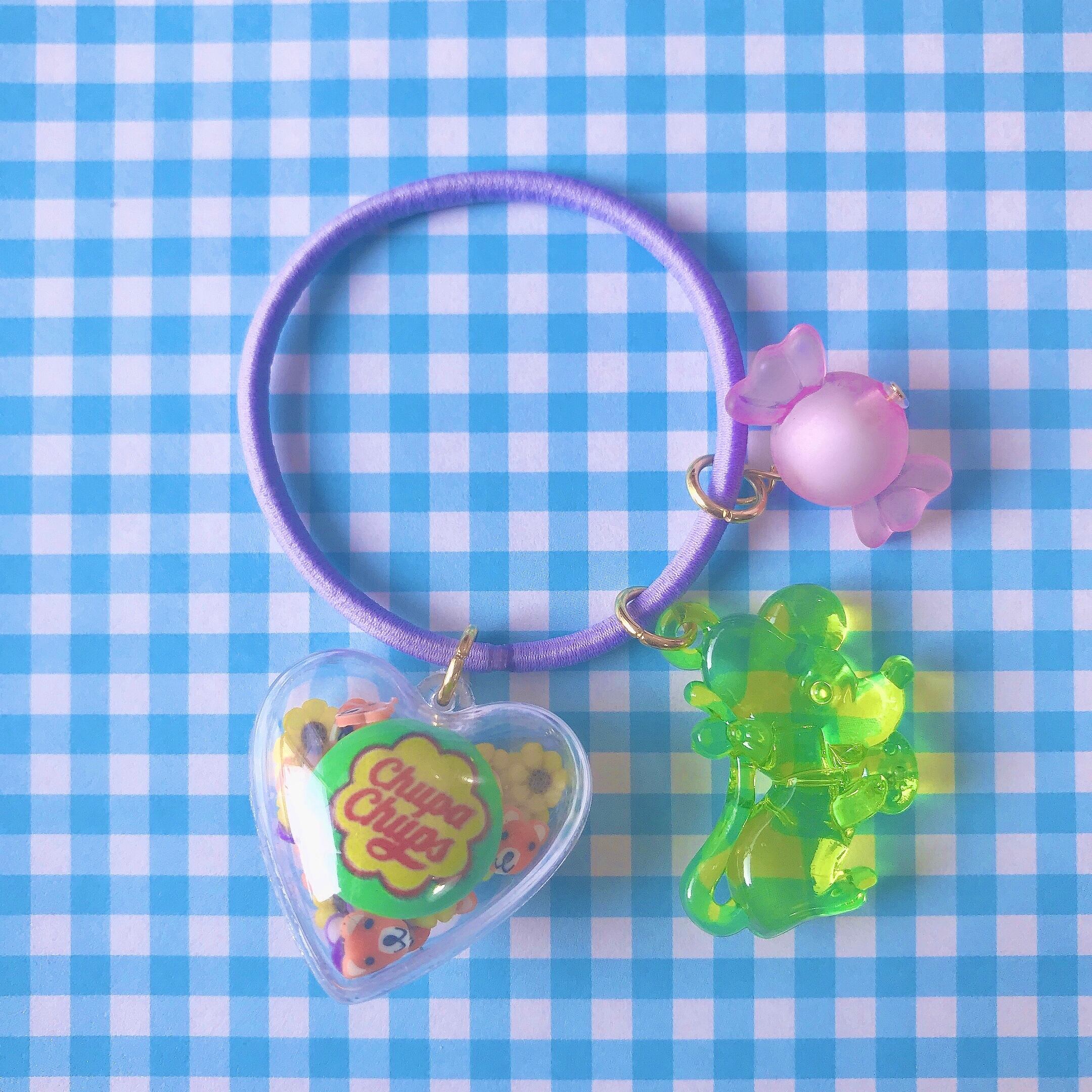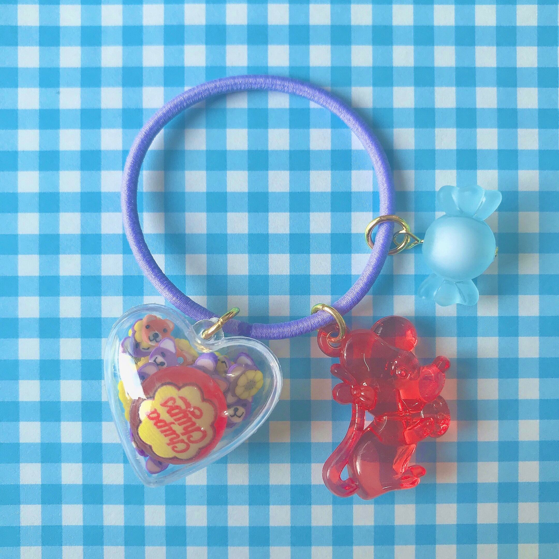 キャンディと2色のクマ&お花のフレークを詰め込んだハートカプセルと、ねずみ、キャンディの3つのチャームが揺れるヘアポニー。