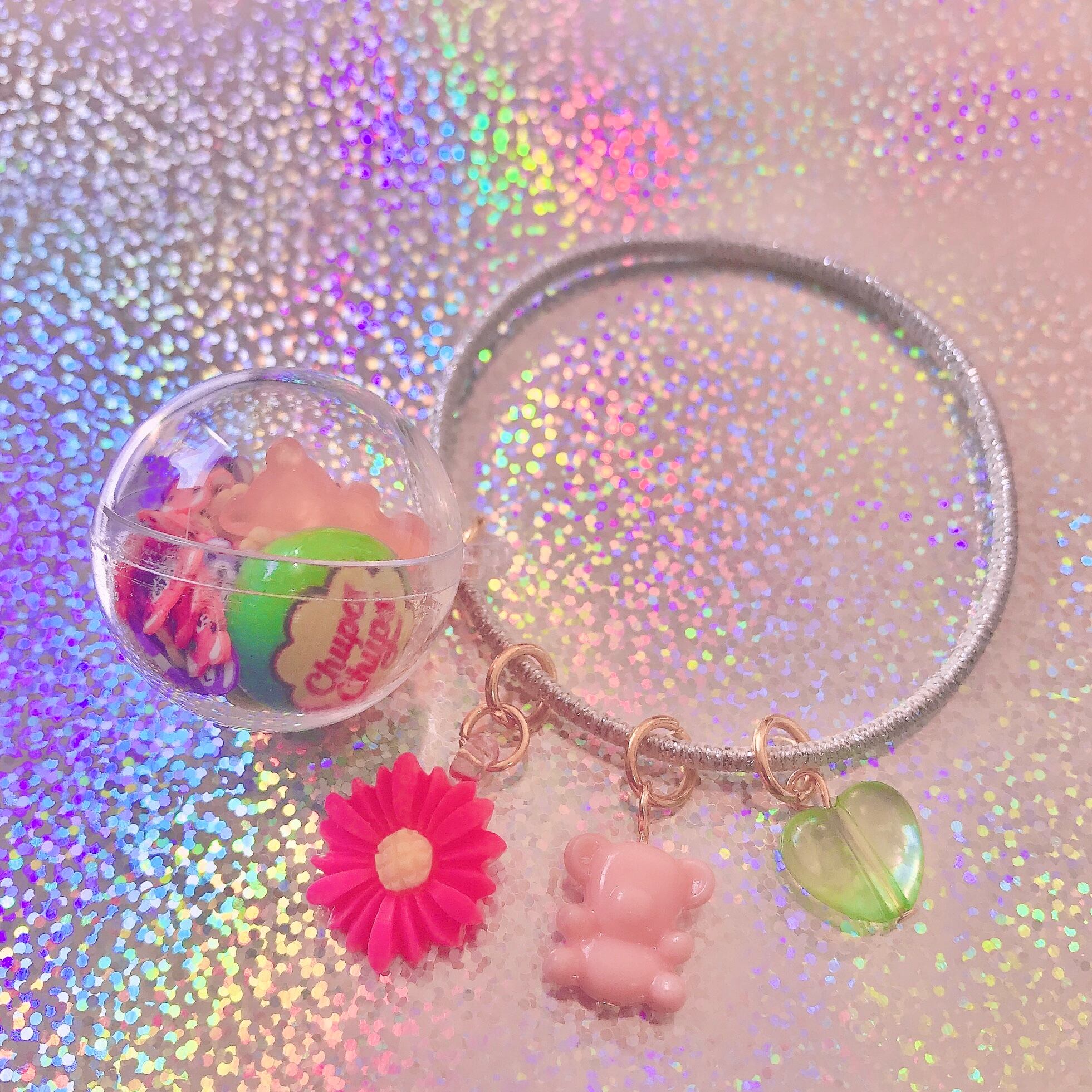 ベアグミやキャンディ、フルーツ、フレークパーツを詰め込んだボールカプセルなど4つのチャームが揺れるヘアポニー