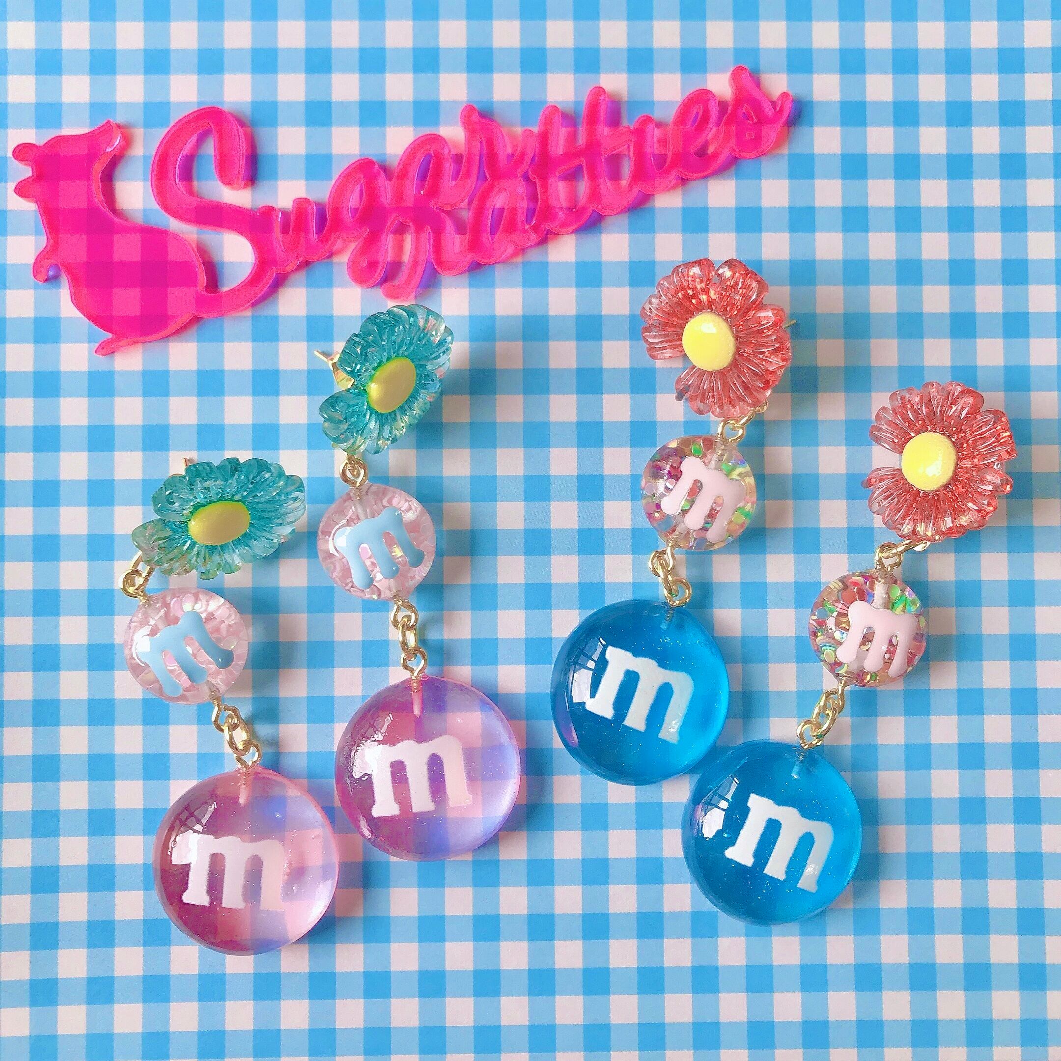 クリアなお花からぷっくりしたホロ入りmチョコと、とうめいの大きなmチョコが連なり揺れるピアス。