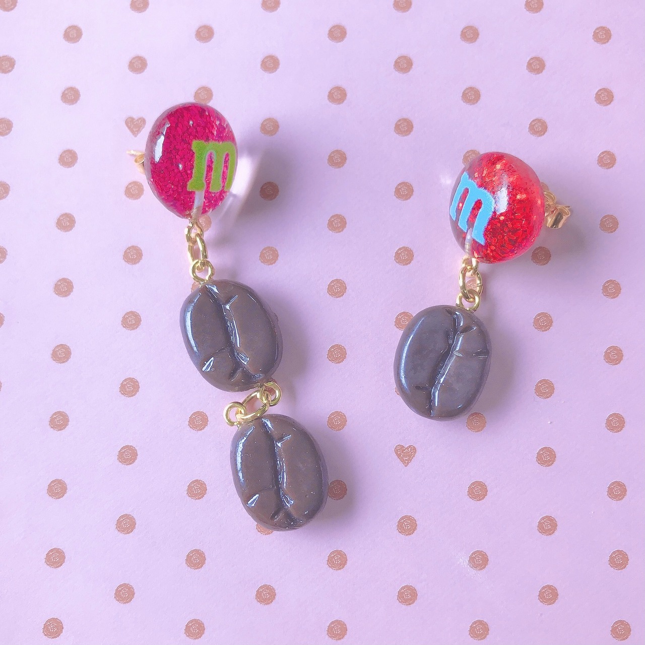 キラキラのラメが入ったぷっくりmチョコから左右数違いのコーヒービーンズが揺れるピアス。