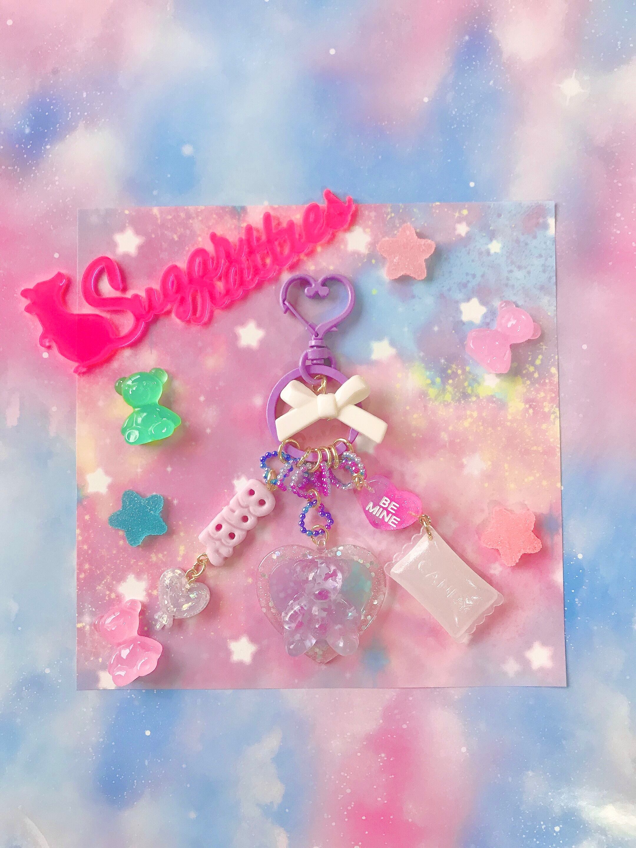 リボンで飾られたハートカンに、大きなハートに貼り付けたテディベアやいろいろなキャンディが揺れるキーホルダー。